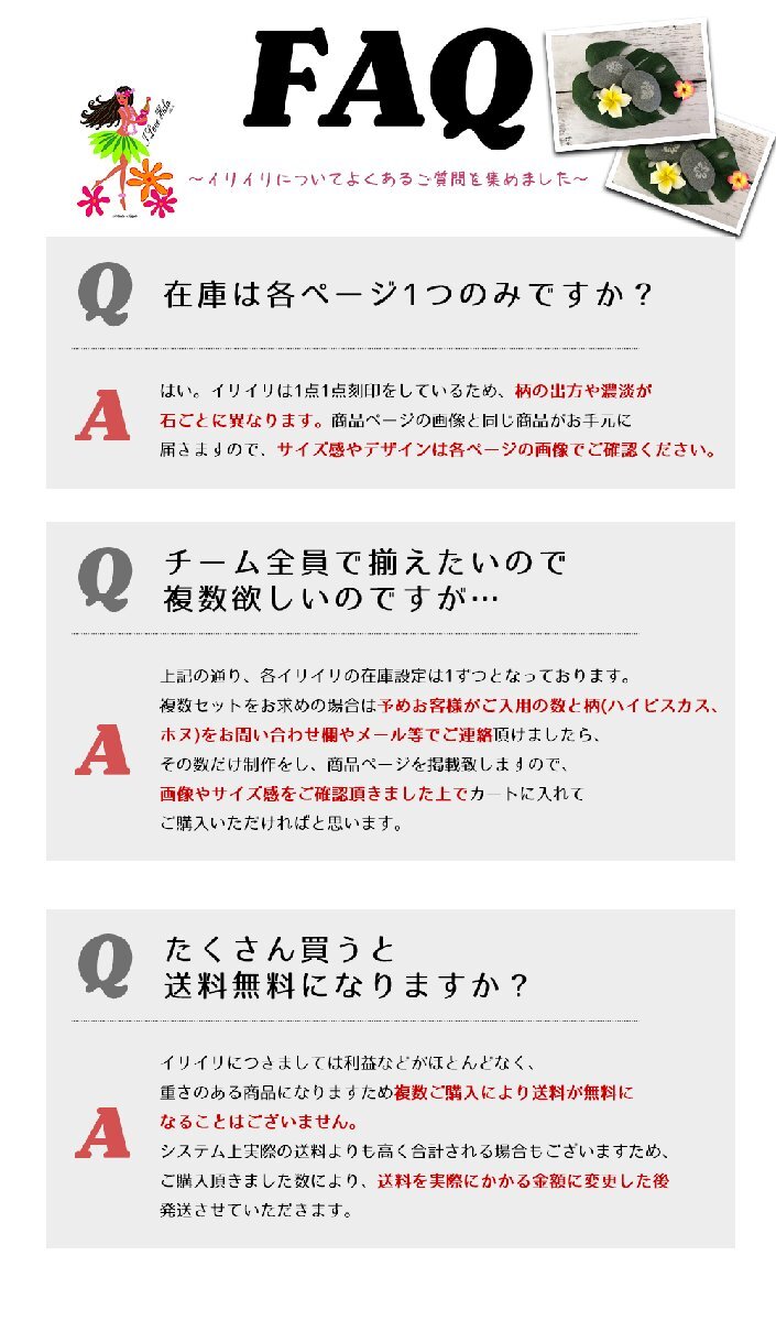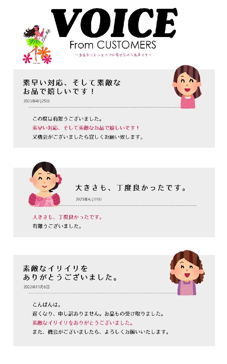 | 当店はイベント出店やハワイ出張等、長期のお休みをいただく場合がございます。 お休み中はご注文いただきました商品の在庫確認がとれないため、 商品代金のお振り込みは必ず当店からの在庫確認メールをご確認いただきました後にお願いいたします。 確認メール前にお振り込み頂き、商品の在庫がなかった場合は振り込み手数料を引いた金額を返金致しますので、ご了承のほどよろしくお願い申し上げます。 | |