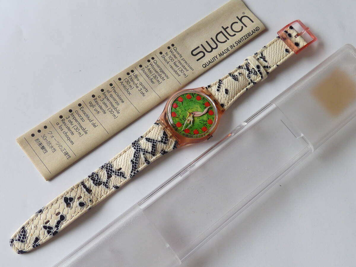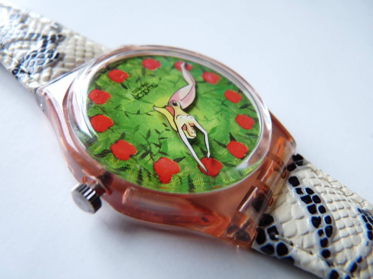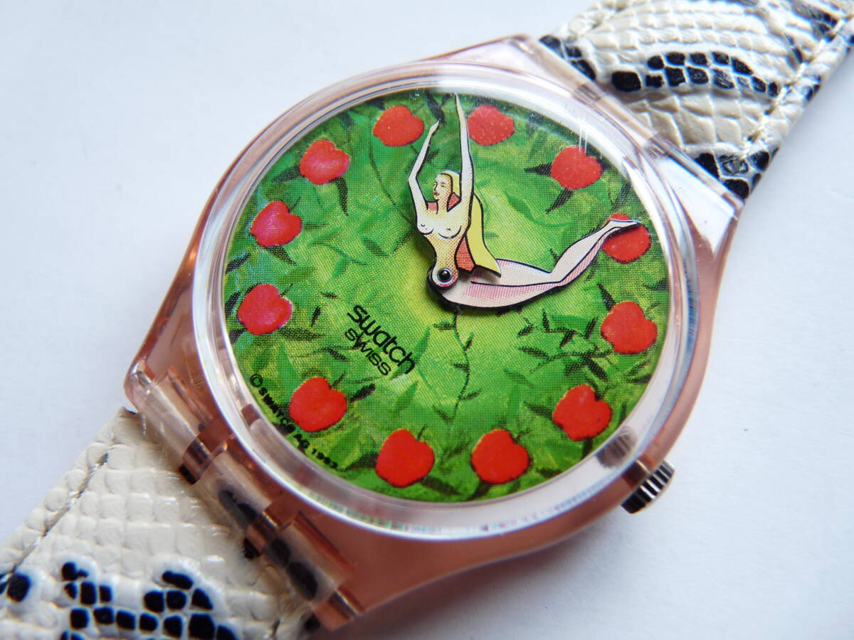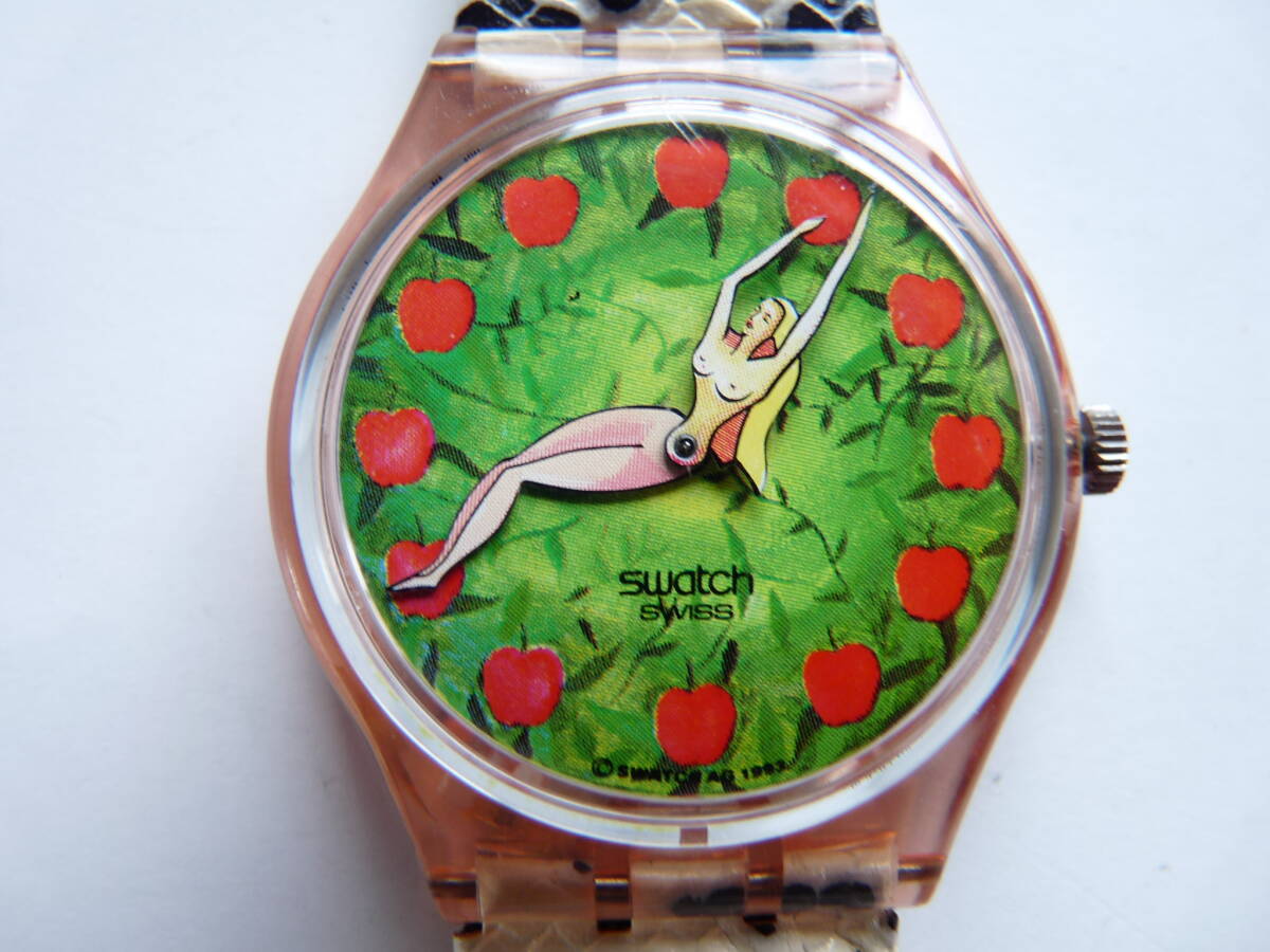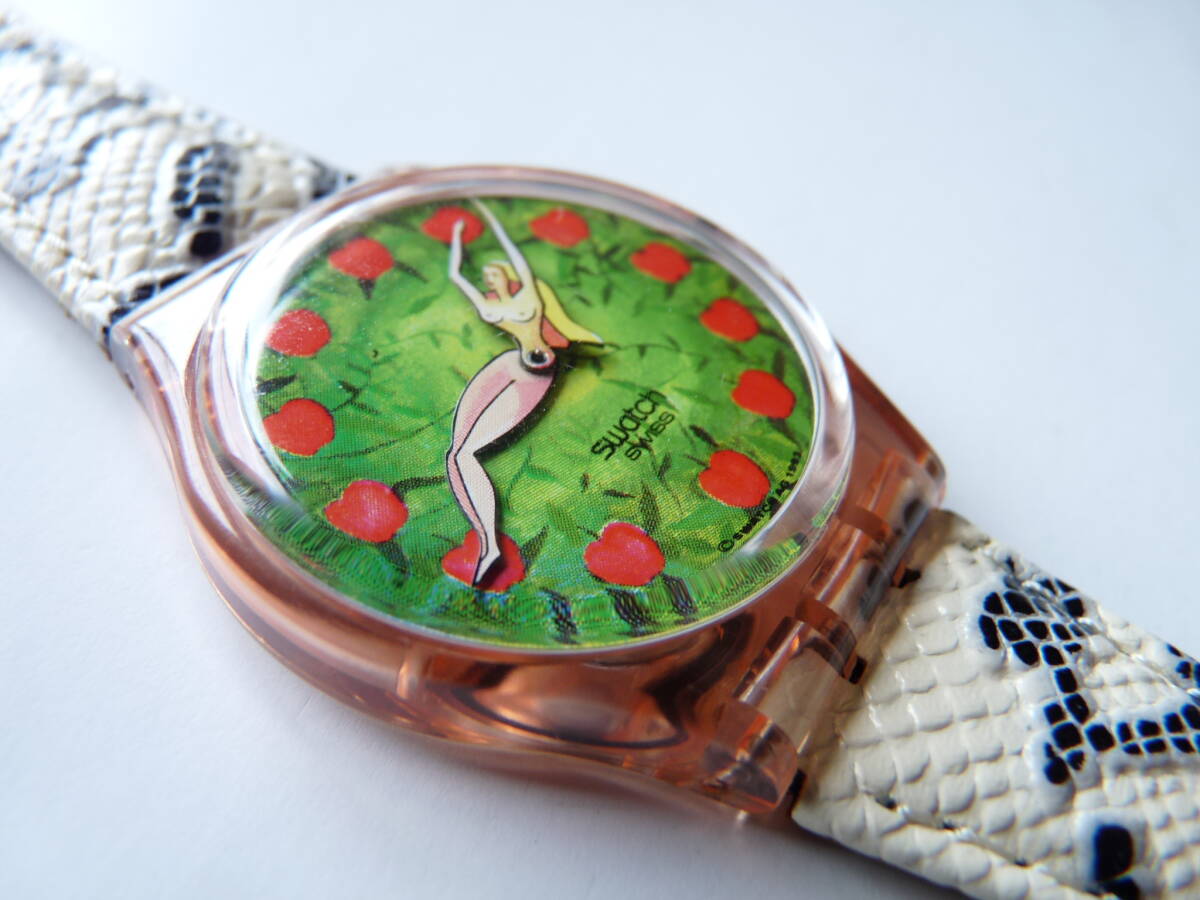 珍品 女性がクルクル回ります 未使用電池交換済 美品 スウォッチ レギュラーモデル Swatch 1994年 アダムとイブ Adam and Eve 品番GP108