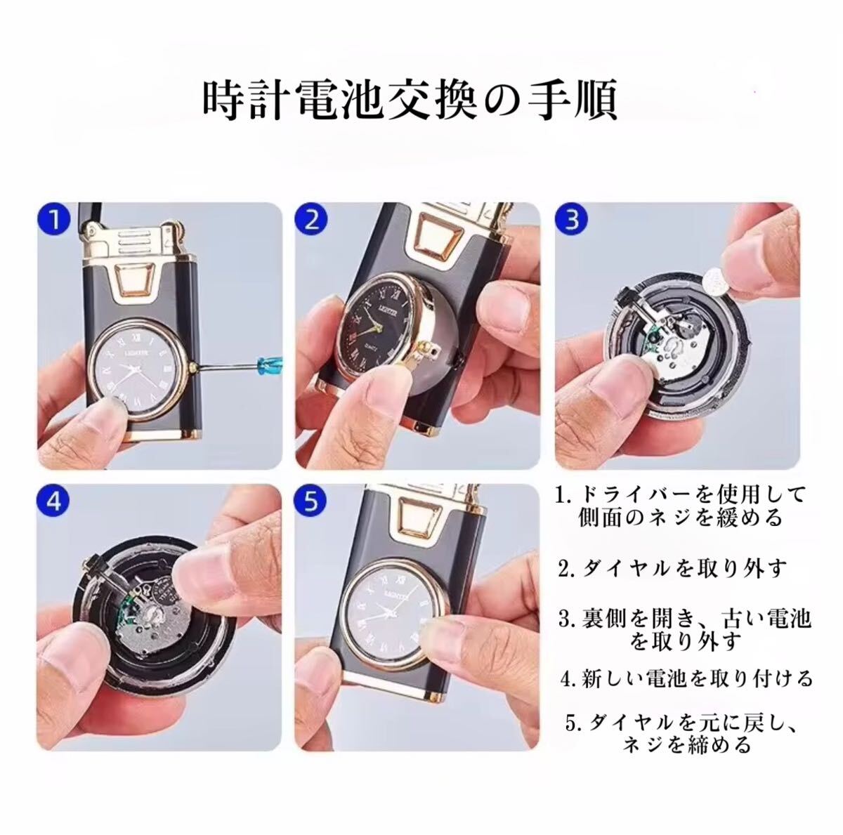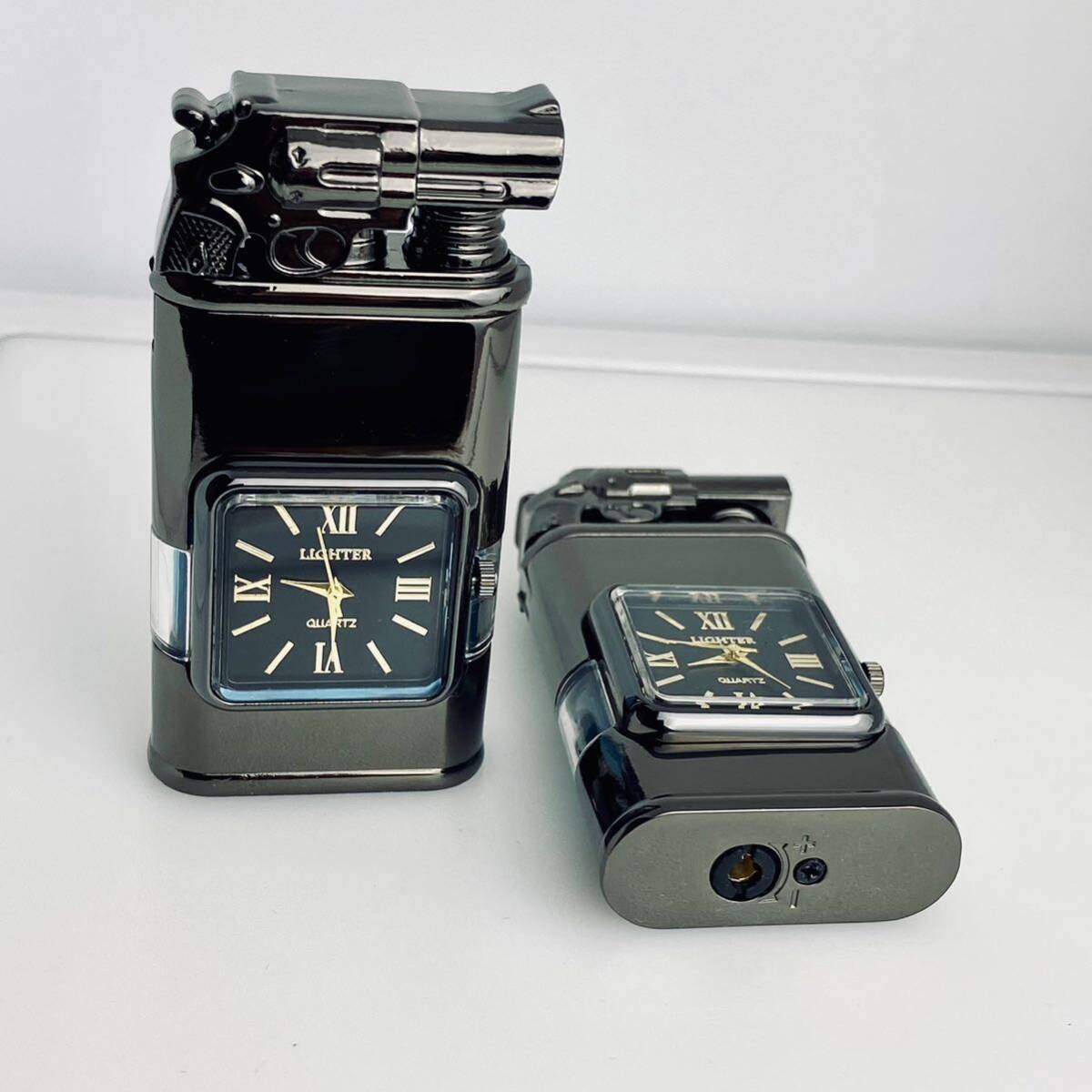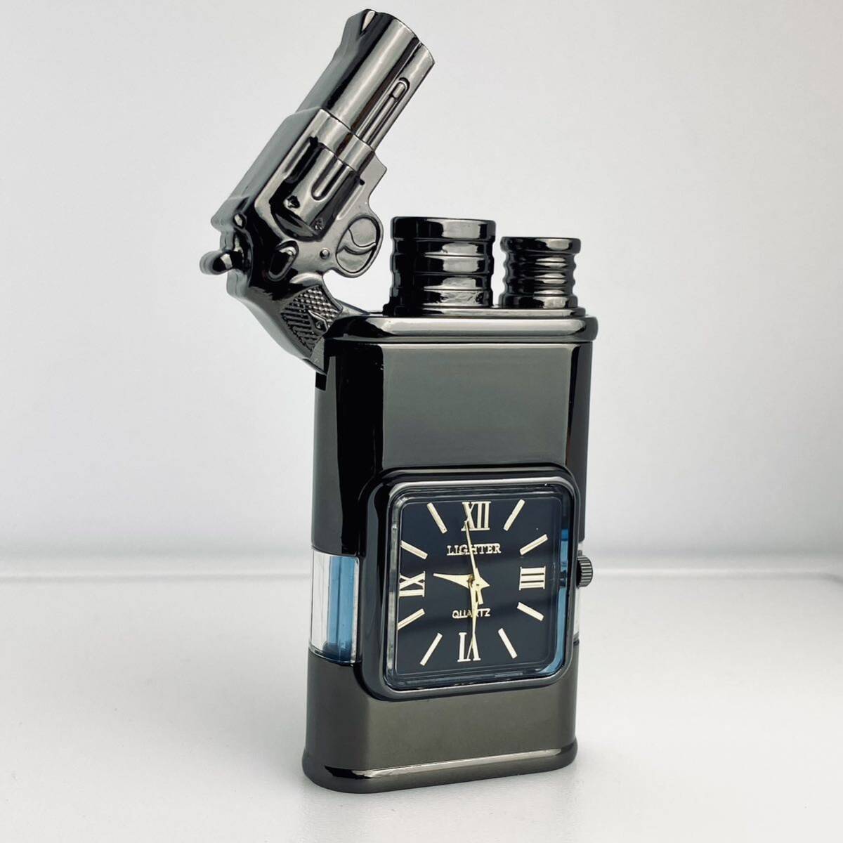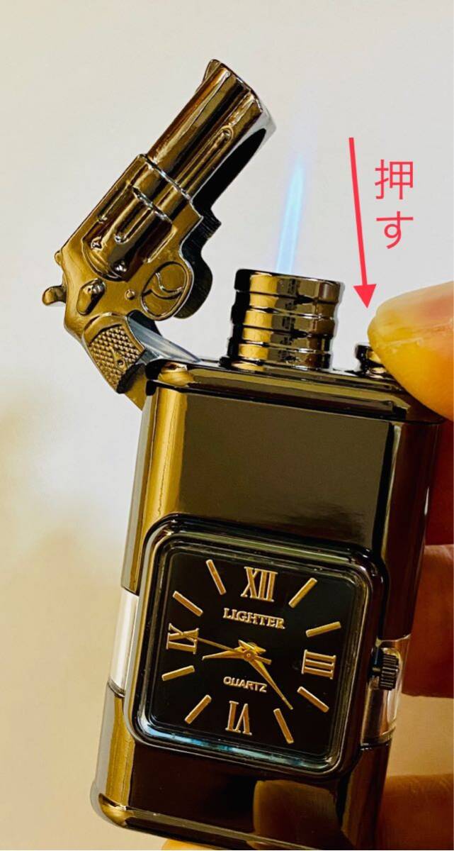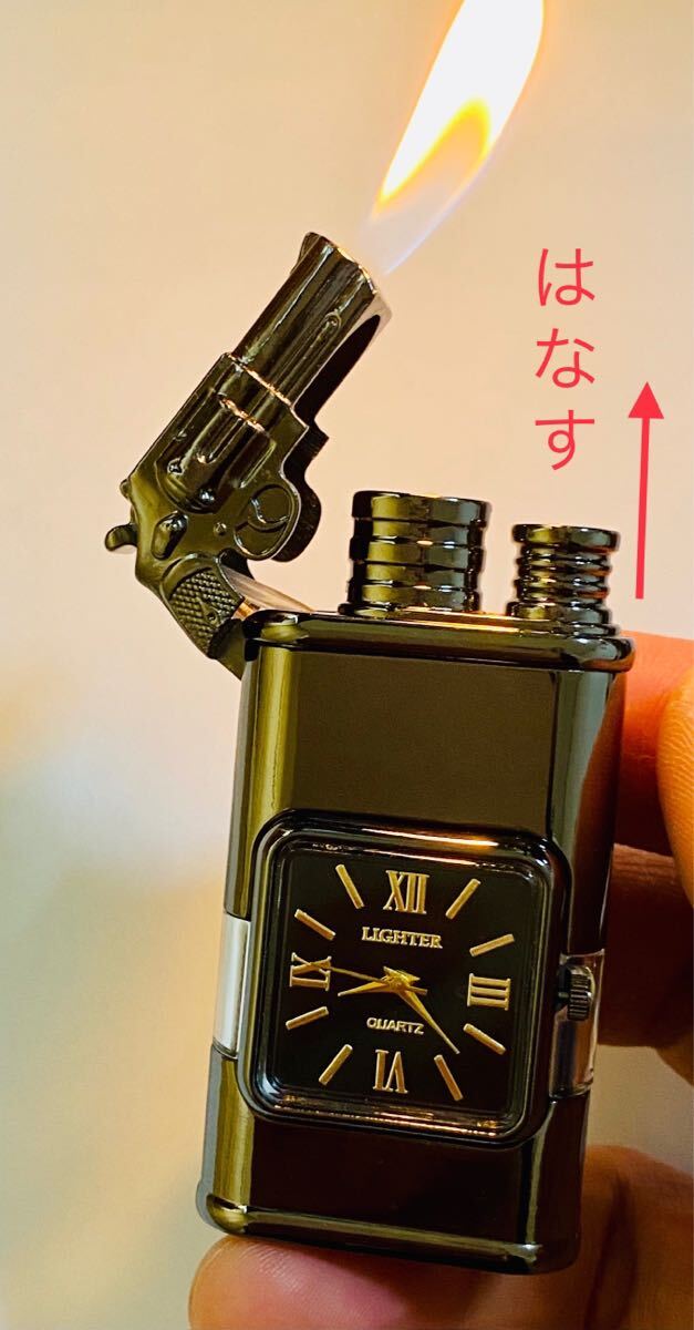 時計と電気ライターの完璧な組み合わせであり、伝統的な点火方法を変える革新的なテクノロジーです。 点火スイッチを押すと青い炎が真っすぐに出てきます。スイッチを放すと直火になります。透明なガスタンクを備えているため、ガスの残量 補充状況を常に把握できます。