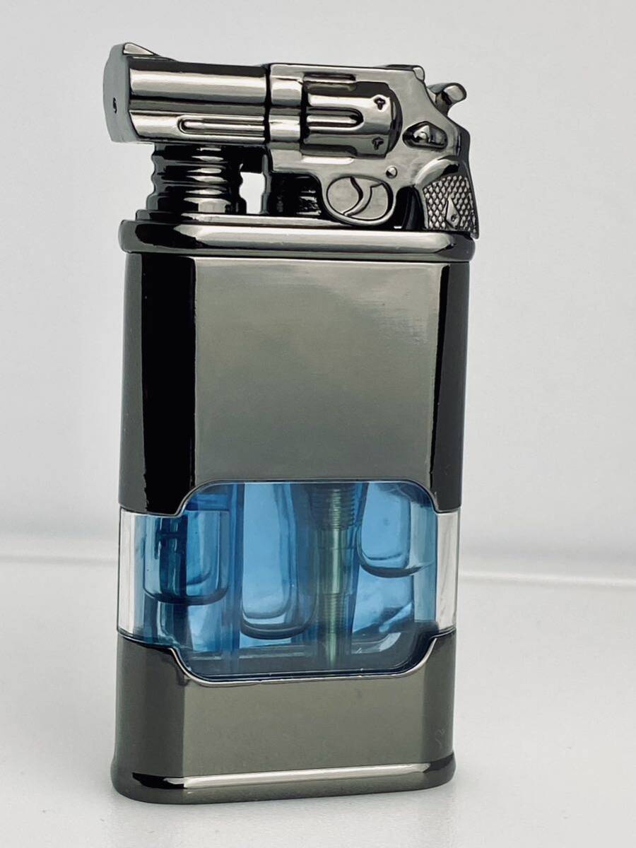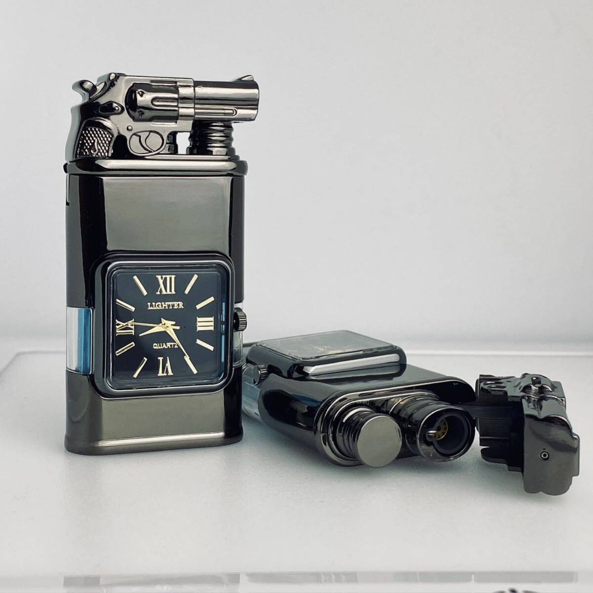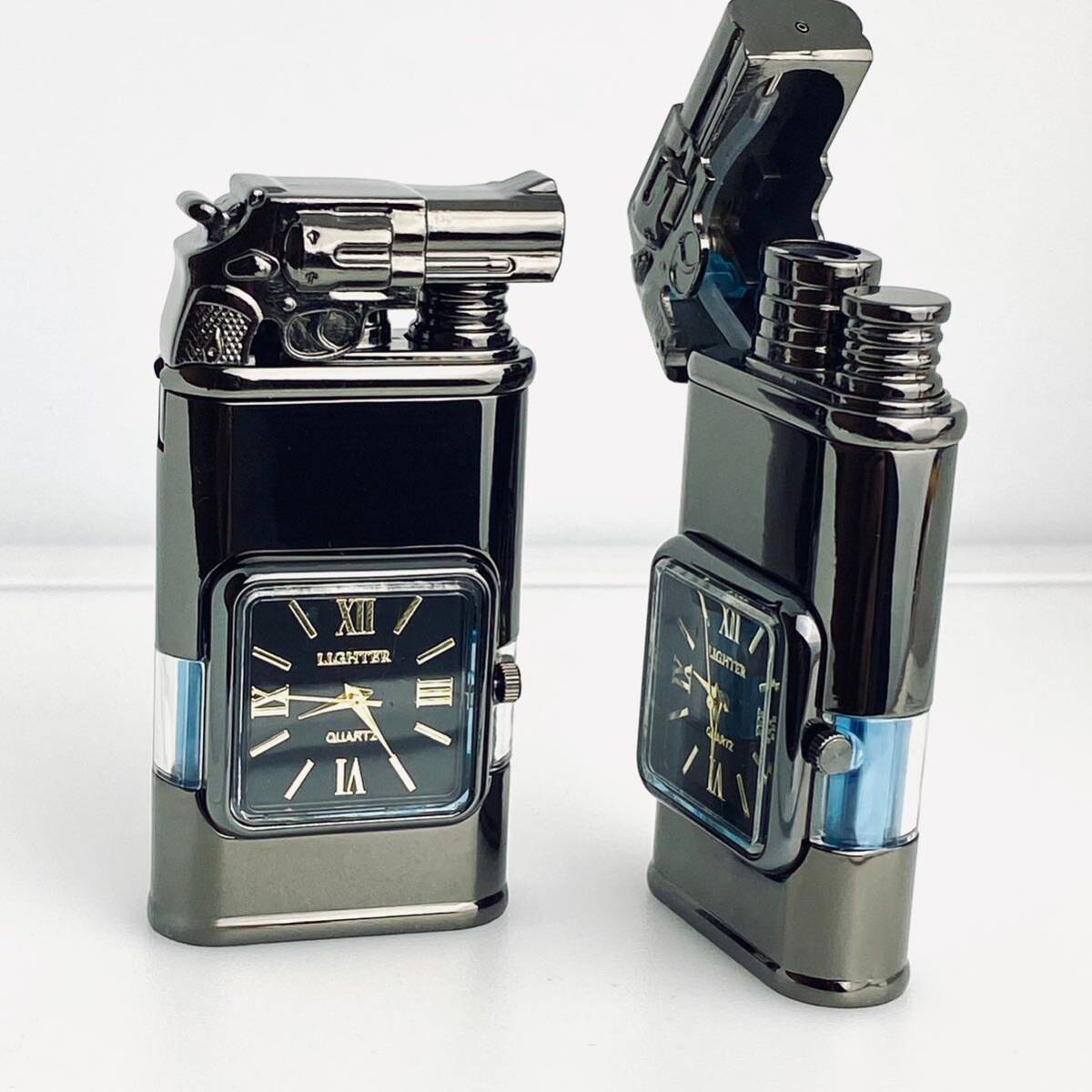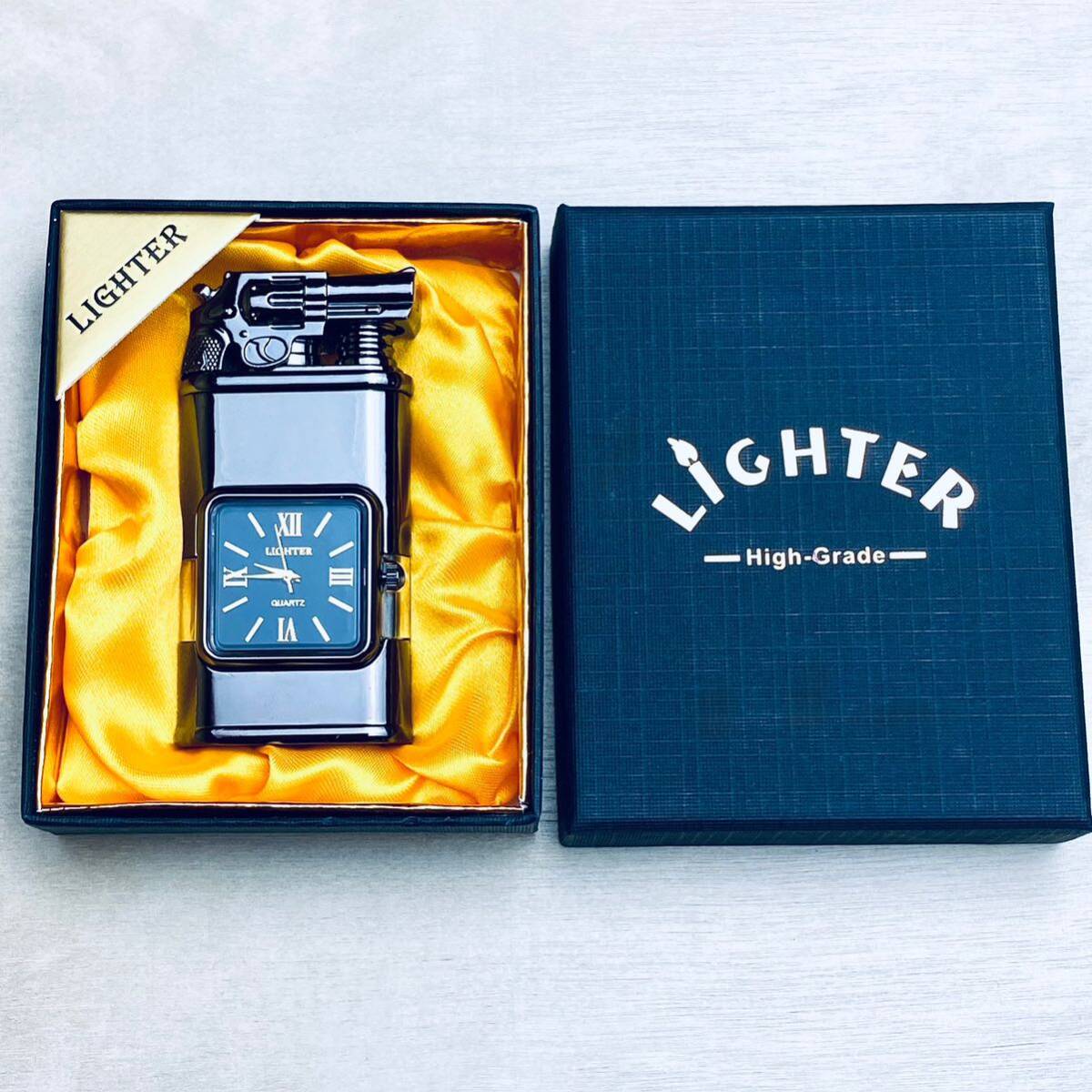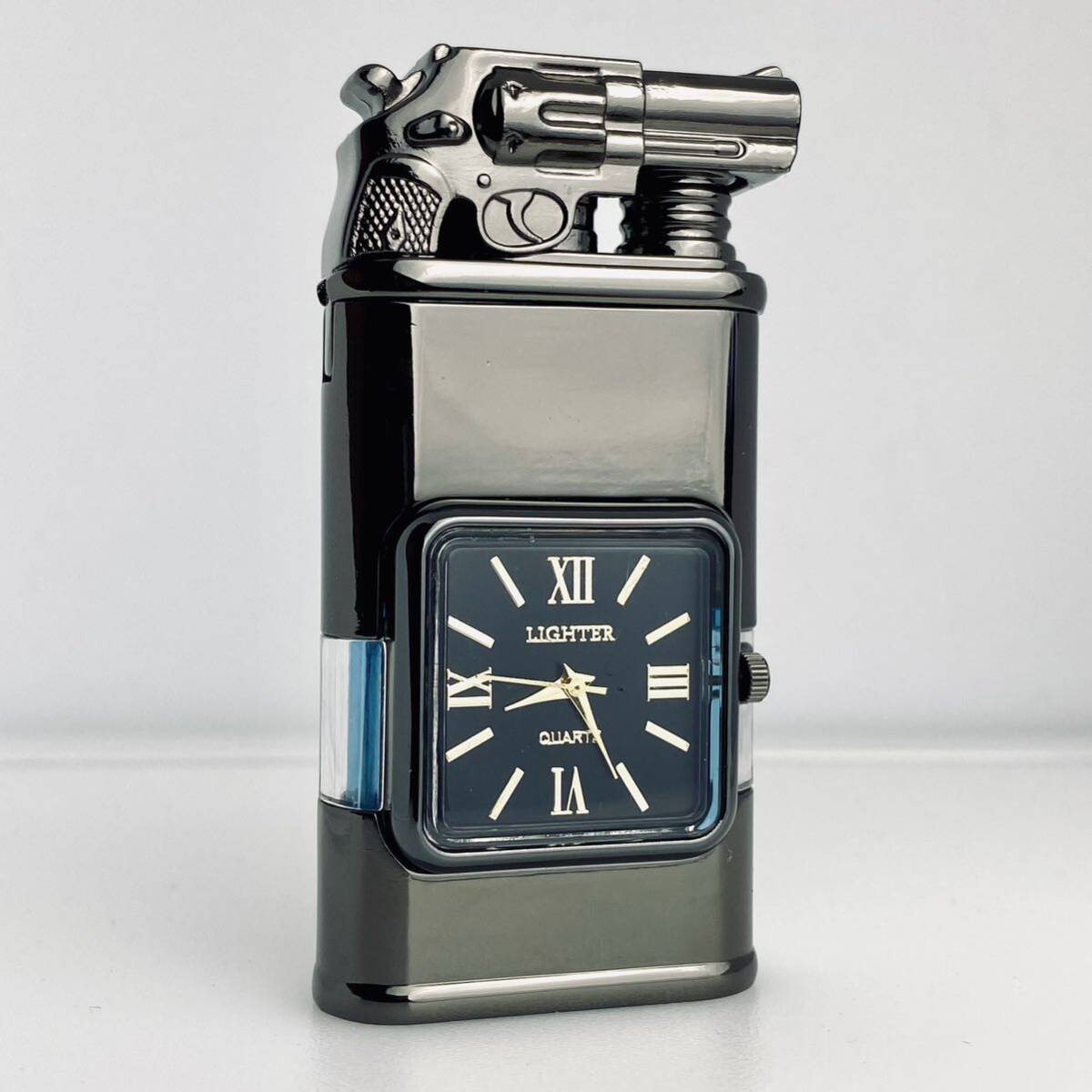 時計機能付き透明ガスタンクジェット炎ソフト炎切替可能ハンドガン型ガスライターターボライター(ギフト箱付き)