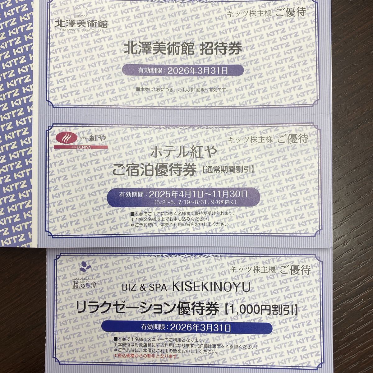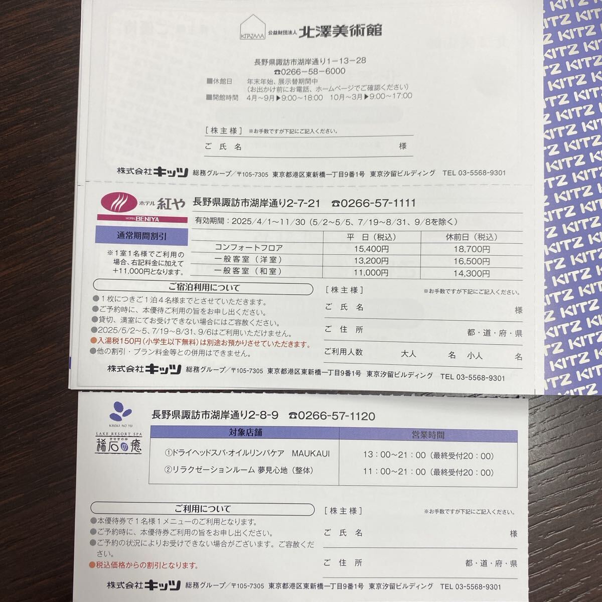 キッツの株主優待で、①長野県の諏訪湖の湖畔にあるホテル紅やのご宿泊優待券(通常期間割引)、②リラクゼーション優待券(1,000円割引券)、③北澤美術館招待券の3枚セットです。