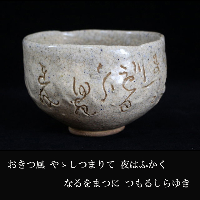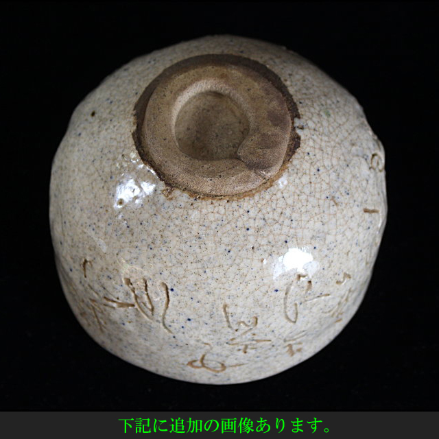 サイズ:サイズ:高7.7cm 蓮月焼 自詠和歌彫 小服茶碗 です。 口の所にニューがあります(写真参照) 高台は付け高台です。 歌の読み 沖つ風 やゝしつまりて 夜はふかく なるをの松に つもる白雪 箱は桐箱です。 写真をご覧の上ご入札宜しくお願い致します。 ◆太田垣蓮月 おおたがき-れんげつ 寛政3年(1791)~明治8年(1875) 俗名:誠(のぶ) 伊賀上野城代老職であった藤堂新七郎良聖の庶子として生まれる。 生後間もなく京都 知恩院の太田垣伴左衛門光古の養女となる。 離婚、再婚その中で子供たちと夫に先立たれる悲痛を経験。 夫の葬儀の後、知恩院で剃髪をし「蓮月」と称す。 岡崎で急須・茶碗などを焼いて生計を立てる。 自作の和歌を書いた彼女の陶器は「蓮月焼」と呼ばれ人気を博す。 75歳のときから神光院の蓮月庵で85歳で亡くなるまでの10年を過ごす。 ◇付高台(つけこうだい) 高台の成形技法の一つ。 同じ素地から削り出すのではなく、別の素地で高台を作り貼り付ける技法。 |