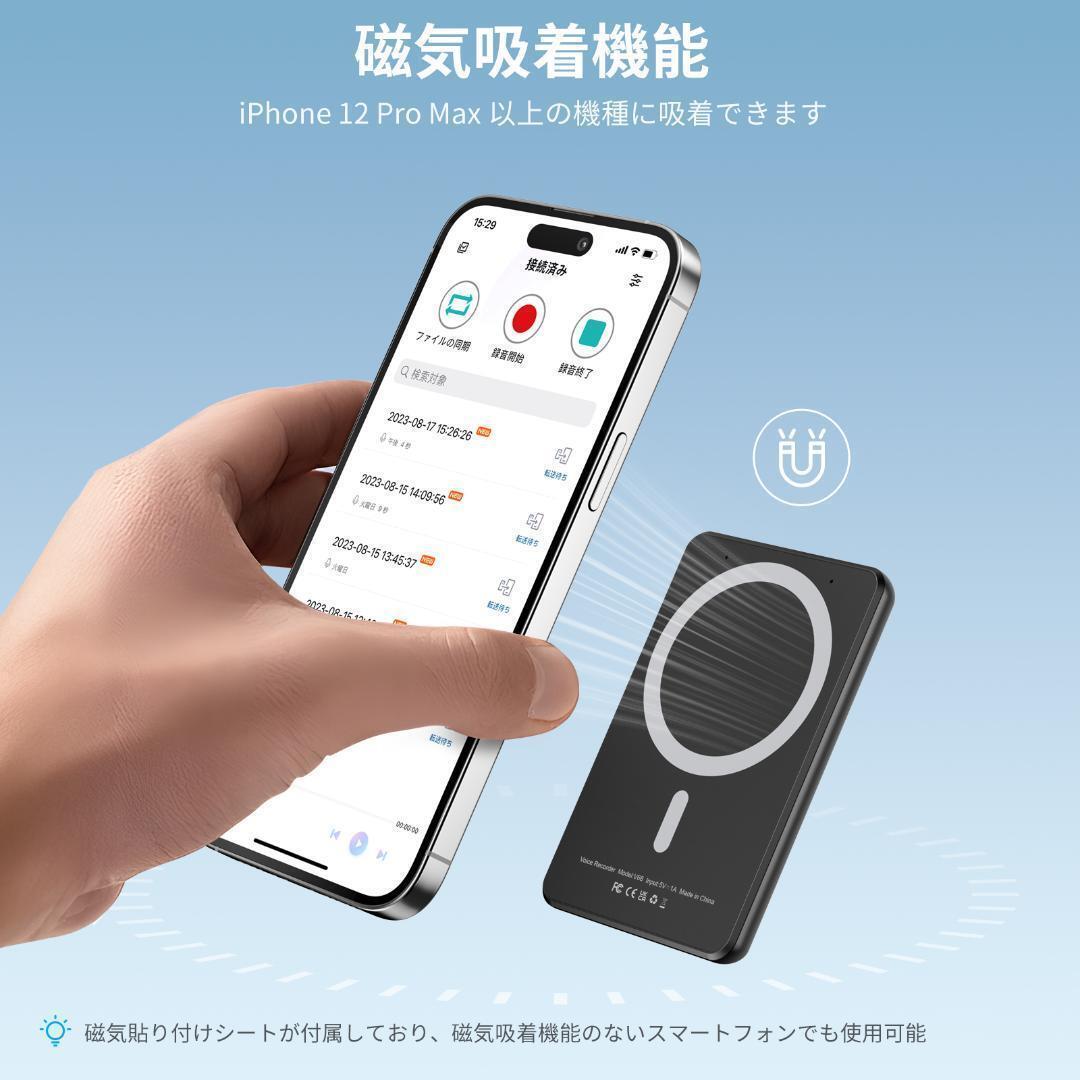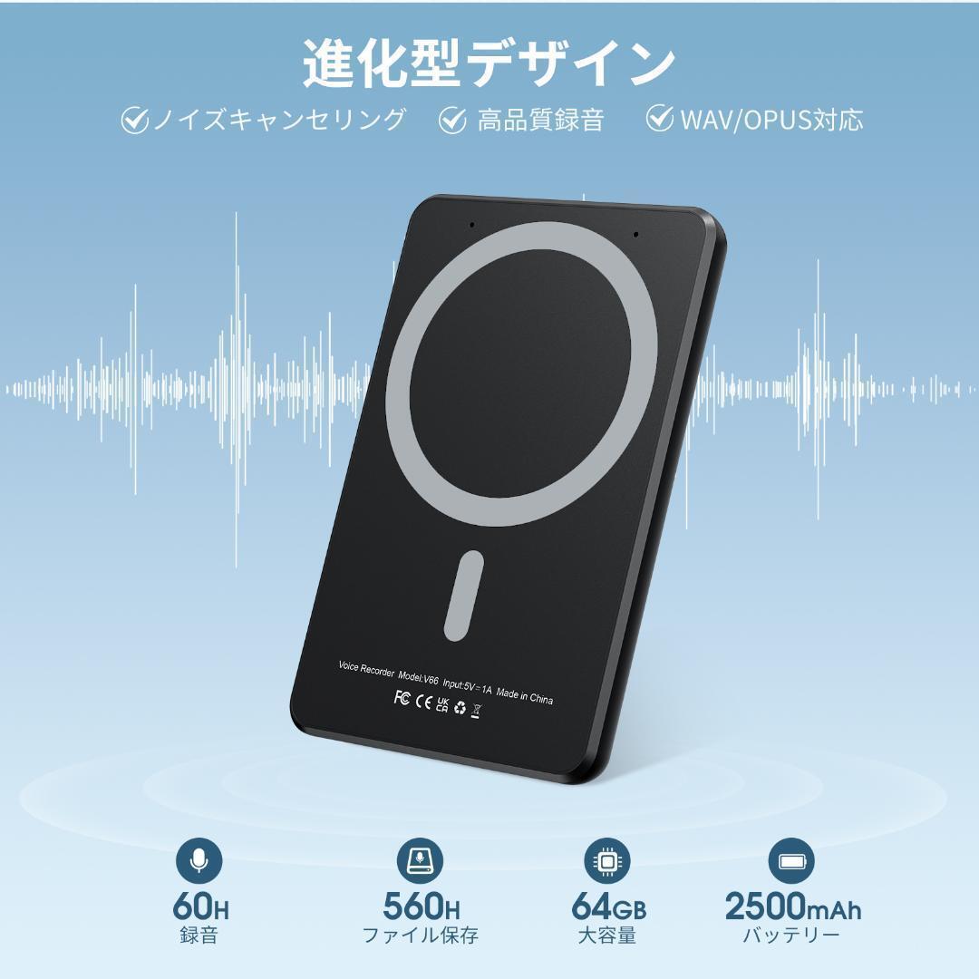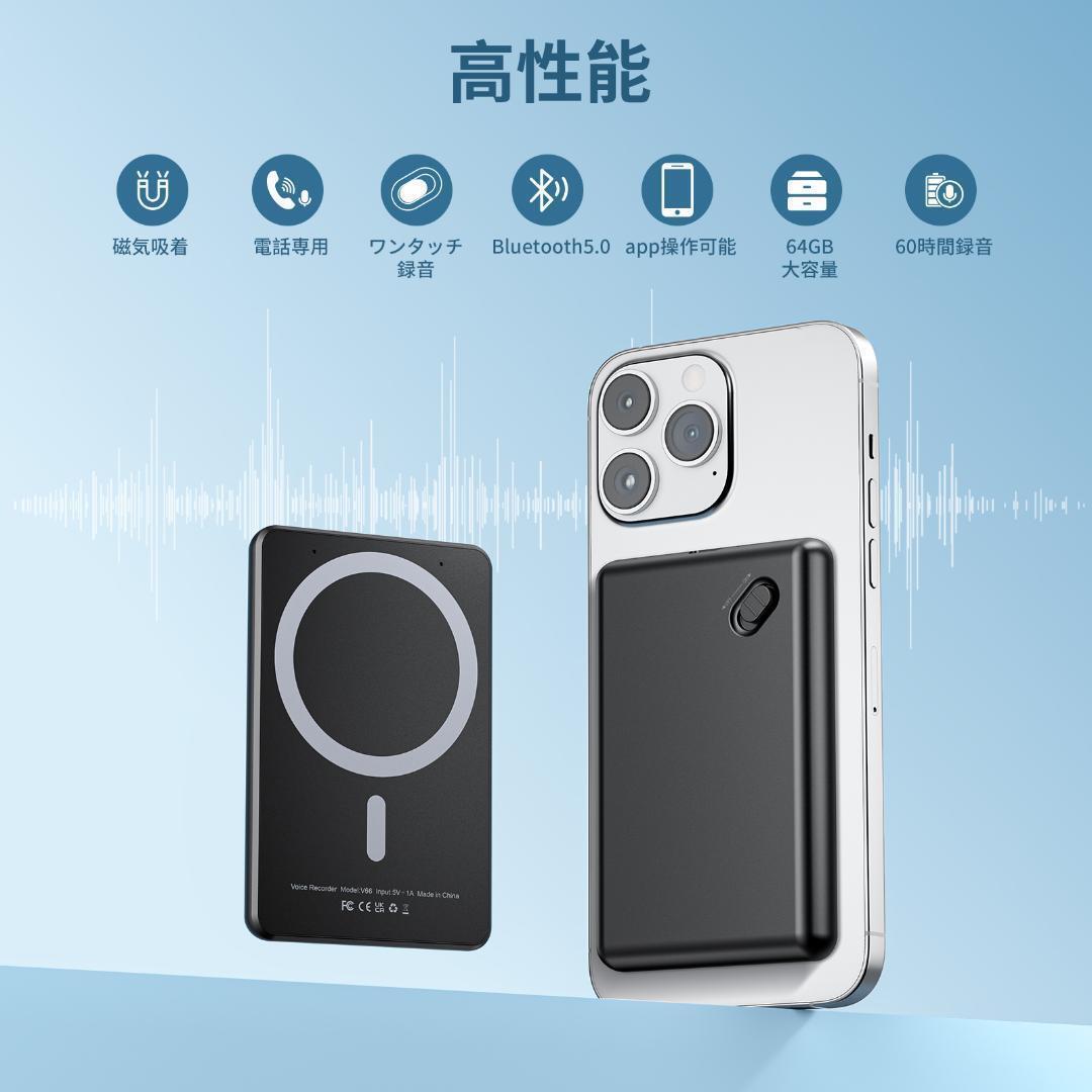 磁気吸着 ボイスレコーダー 64GB内蔵 60時間連続使用可能 録音 ワンボタン録音 レコーダー 通話録音 電話録音 icレコーダー android app対応 小型 480時間分の録音データ保存可能 2500mAhバッテリー スマホ スマートフォン 携帯用 V66QA1磁気吸着機能が特徴です。磁気吸着機能のない携帯電話には、磁気吸着ステッカーをお付けしています。Bluetooth 5.0を使用し、独自に開発した専用アプリに接続可能です。ファイルはスマートフォン上で同期し、カスタムファイル名の設定、共有、アプリを使用しての録音、一括削除などが可能です。大容量の64GBメモリは最大で480時間分の録音ファイルを保存でき、内蔵の2500mAhバッテリーは最大で60時間の録音が可能です。