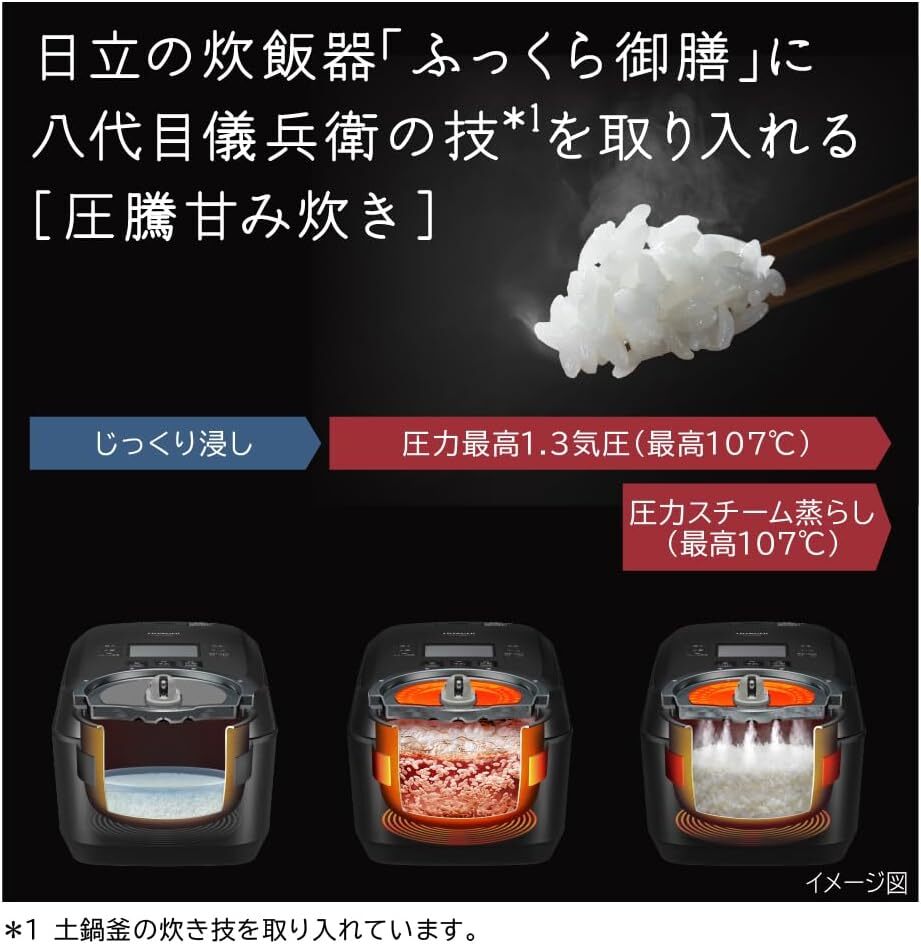 品名 日立 RZ-V100HM フロストホワイト 大火力で沸騰、圧力スチームで蒸らす「圧騰甘み炊き」採用のIHジャー炊飯器(5.5合)。京の米老舗「八代目儀兵衛」が監修。 「蒸気カット」により、蒸気がほとんど出ない。好みや用途に合わせて炊き上げる「極上」コースや少ない量でも快速炊飯できる「快速」コースを搭載。 「冷凍用」コースを備え、レンジであたためるとパサつきを抑えたふっくらしたごはんが食べられる。ごはんをしっとり保つ「スチーム保温」が可能。 |
