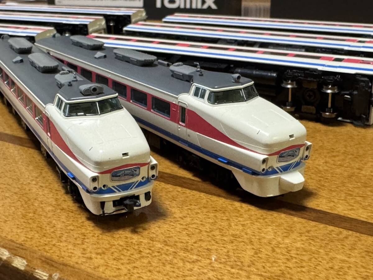 TOMIX 製JR489系特急電車(金沢運転所・H03編成・白山)基本5両セット(品番98594)+増結4両セット(品番98595)の合計9両セットです。最新ロットです。購入後、ライト・動力確認のみです。外箱は保管中の小傷があります。HMパーツ類は未使用で付属します。動力、ライト点灯問題ありません。エアパッキンで包み、箱に入れて発送します。以上を了承の上、あくまでも中古品としてご理解いただきノークレームノーリターンをご理解いただける方のみご入札ください。写真に写っているものがすべてです。細かいことにこだわる方の入札はご遠慮ください。