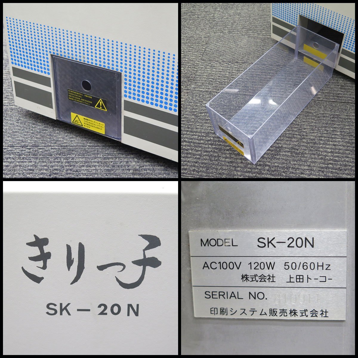 ![]() ●上田トーコー 自動裁断機 きりっ子 の出品です。 ○自動裁断機(名刺カッター?) メーカー:上田トーコー 品名:きりっ子 型番:SK-20N 外形寸法(mm/約):W565×D414×H348 電源:AC100V 50/60Hz 付属品:電源コード(取扱説明書等は付属しません) 譲り受けた設定のまま動作確認を行いました。 起動すると液晶ディスプレイに「はがき」モードの表示があり、 用紙をセットしてスタートするとハガキサイズにカットされました。 ネットで調べたところ名刺カッター(ハガキ兼用?)のようですが、 取扱説明書がなく操作方法が判らない為、名刺カットは未確認です。 上部カバーを取り外すとスリッター?に「ハガキ用」とシールが 貼られていましたので名刺用のスリッターが必要な可能性もございます。 ※当方に名刺・ハガキ用の厚手用紙の手持ちが無かった為、 A4普通紙を使用してテストカットを行いました。 【※動作確認の動画はこちら(ハガキカット)】 外観上、キズ汚れや日焼けのような色褪せなどの使用感や 経年感はございますが大きなダメージは見受けられません。 当方では詳細なチェックや機能確認は行えておらず精度なども 判断出来かねます。また、古いモデルだと思われますので ジャンク品として現状でのお渡しとさせて頂きます。 ご不明な点がございましたら、お気軽にお問い合わせ下さい。 ●送料について ●[落札後、発送に関して詳細事項(大型1P)] 落札者様の発送先が法人様宛 または 個人様宛によって、 お届けの可否や送料が異なります。 ※発送先が法人様宛の場合は基本送料のみですが、個人様宛の場合、 基本送料とは別に『個人宛配達料』が必要となります。(下記参照) ※木パレットを土台にしての梱包を予定してます。 また、直接のお引取りも歓迎いたします。 ●[運送会社] 西濃運輸(元払い発送のみ/着払い不可) ●[法人様宛](営業所止め可能) 送料:東京・福岡まで(当方発送より)3,500円程度(税別)になります。 北海道・沖縄・一部離島の方は別途御見積させて頂きます。 ※送料は地域により変動致しますのでQ&A欄でご質問下さい。 ドライバー(1人)が軒先まで配達させて頂きます。 荷降ろしの際にお手伝いが必要となります事をご了承ください。 ※予め購入手続き時の要望欄にて法人名の申告をお願いします。 〇[個人様宛] (営業所止め可能) 送料合計:東京・福岡まで(当方発送より)11,000円程度(税別)になります。 [送料内訳]:基本送料 7,000円程度+個人宛配達料 4,000円 (※1個人様宛でご住所までのお届けは基本送料とは別に個人宛配達料が必要です) (※2営業所止めをご希望の場合は個人宛配達料は不要です。) 北海道・沖縄・一部離島の方は別途御見積させて頂きます。 ※送料は地域により前後致しますのでQ&A欄でご質問下さい。 ※一部地域によっては発送をお受けできない場合がございます。 出品期間内、事前にご質問欄よりご確認の上、ご入札をご検討お願いします。 ●[消費税について] 落札価格と送料に対して消費税をお預かり致しますのでご了承ください。 |