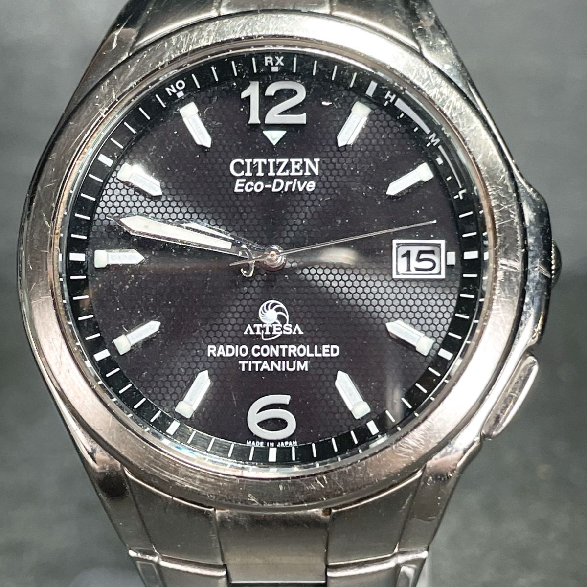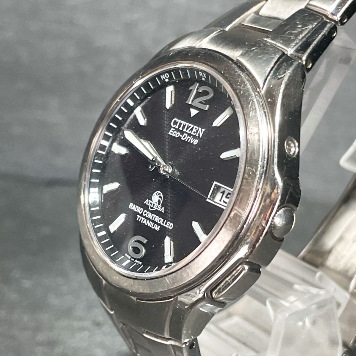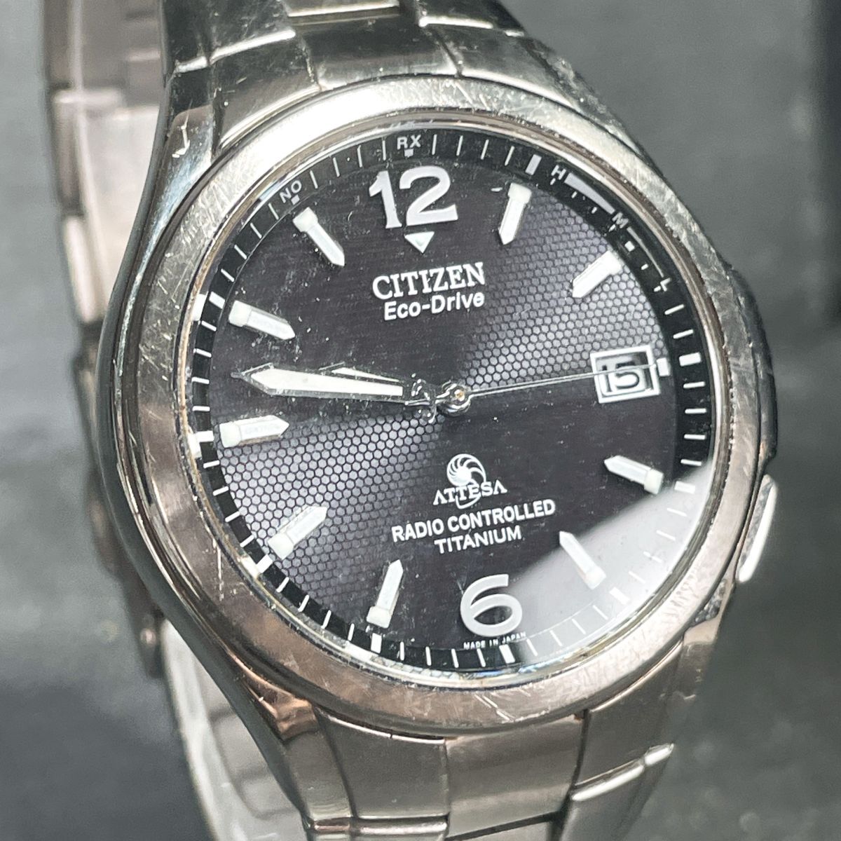 美品 CITIZEN シチズン ATTESA アテッサ H410-T003738 腕時計 アナログ 電波ソーラー 3針 カレンダー メタルバンド チタニウム ブラック