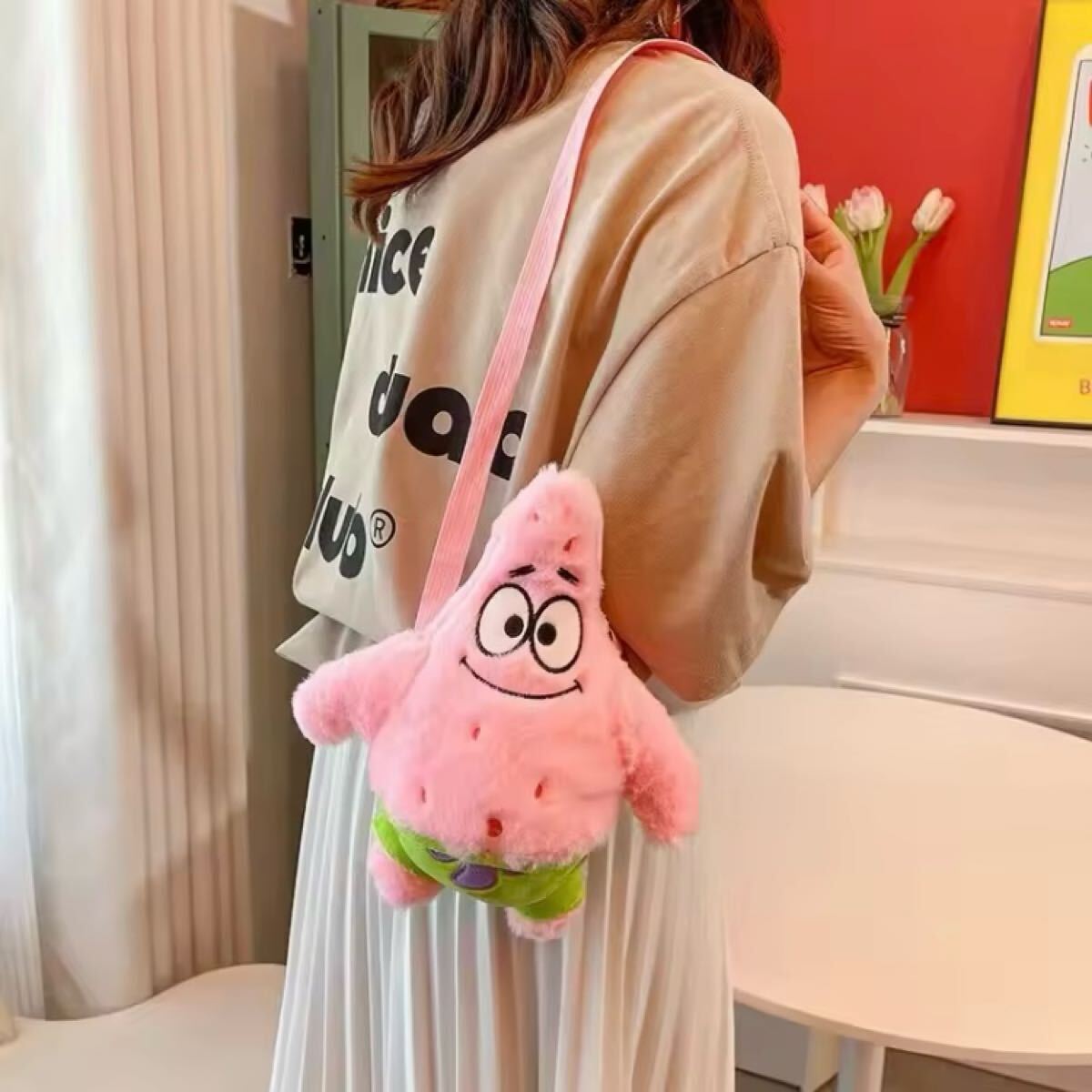 こちらは海外で販売されているパトリックのぬいぐるみショルダーバッグです。