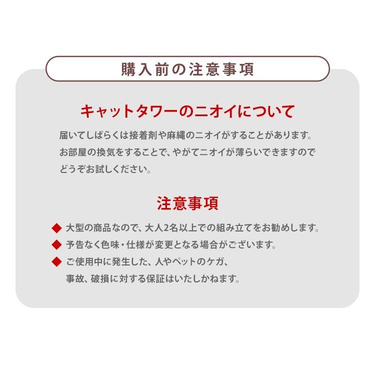 上下運動でストレス解消! 長ーく使える置き型タイプのキャットタワー!! 支柱は爪とぎできるタイプでネコちゃんのストレス解消に。 トンネル付きでゆっくりとくつろげます! ★Point1:すぐに設置できる イラスト説明書付で誰でも簡単に組み立て可能! ★Point2:運動不足予防に 日常的に上がり下がりをすることで、室内飼いのネコちゃんの運動不足解消につながります! ★Point3:高い場所に上がれる ネコちゃんは高くて狭い場所もお気に入り♪ 高い場所から外の景色を眺めたりするのもストレス発散に繋がります。 ■商品コード:PT0011A ■商品仕様 カラー:ベージュ サイズ(約) 全体:幅51×奥行46×高さ84cm ※最大サイズ 台座:幅45×奥行46cm 重量:(約)7kg 耐荷重:(約)15kg 材質:紙管、麻、パーティクルボード 他 ■内容 ・キャットタワー本体 ×1(組み立て必要) ・組み立て用工具一式(ボルト、六角レンチ) ■注意事項 ・組み立て式(未完成品)です。 ・製品は接着剤や麻の臭いがすることがあります。臭いが気になりましたら、風通しの良いところで陰干しして下さい。 ・凸凹のある床、柔らかい材質・滑りやすい場所では倒れたりする危険がありますので設置しないようお願いします。 ・麻の材質上、繊維クズが出ますが不良ではございません。 ・大型商品なので大人2人以上での組み立てをお勧めします。 ・写真と実物は多少異なる場合がございます。あらかじめご了承下さい。 ■保障期間 7日間 ※商品到着後7日以内の初期不良・破損のみご対応させていただきます。 【新品未使用品です】 |
