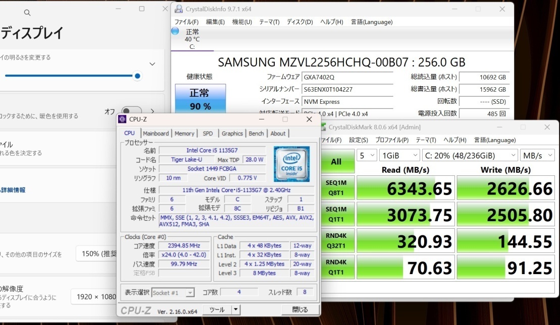 | CPU: 超高速 Intel 卓越性能 第11世代Core i5-1135g7 2.4Ghz、 4コア8スレッド (ターボ・ブースト利用時の最大周波数 4.2GHz) |