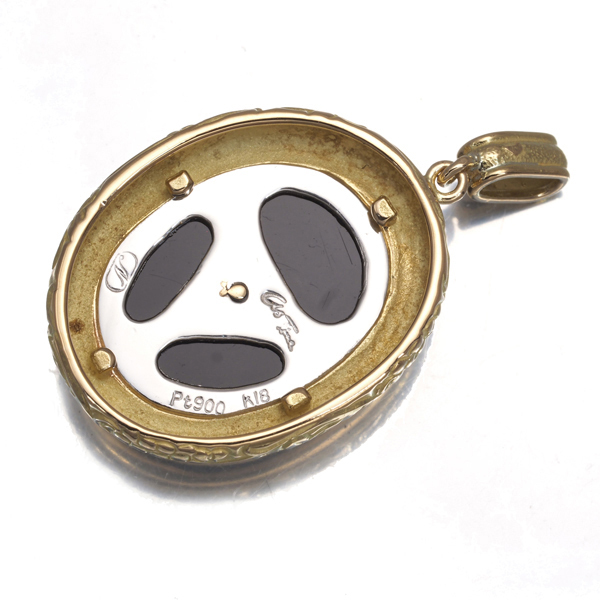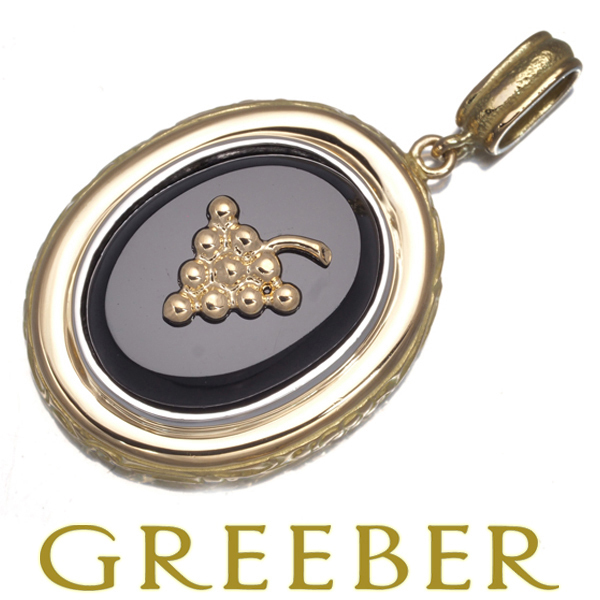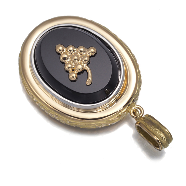 漆黒のオニキスに葡萄のデザインが輝くアズタイムのペンダントトップ。イエローゴールドの枠には素敵な装飾が施されておりますよ。 |