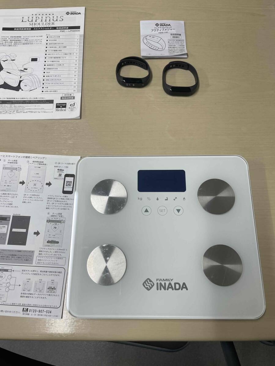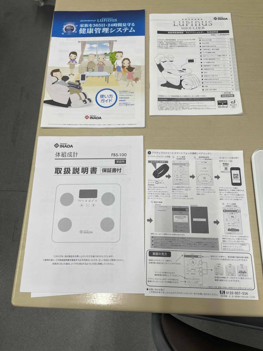 測定データをルピナスショルダー搭載のディスプレイで一括表示できる体組成計「FBS-100」、脈拍や歩数が測れるアクティブメジャー。