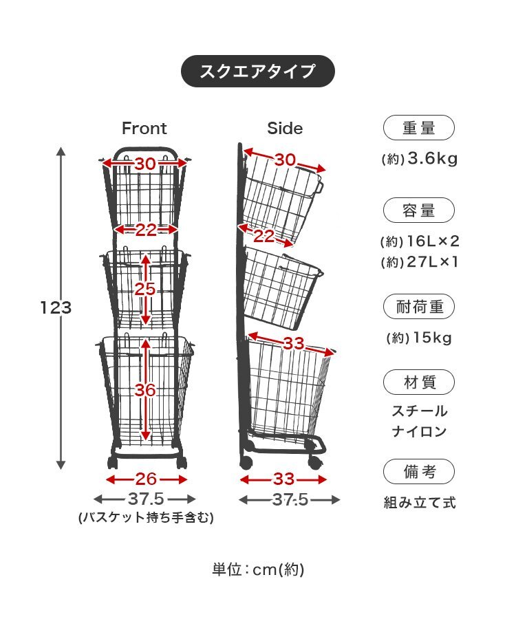 こちらの商品は幅約37cmのバスケットを3つ縦に並べることが可能。 デッドスペースを活用することで物が多くなりがちな洗濯機まわりも無駄なくすっきり。 狭くなりがちなスペースを有効に活用することができます。 3つのバスケットは取り外しも可能で、持ち手があるのでベランダに運ぶ時なども便利にお使いいただけます。 キャスター付きで、ラックごとの移動もスムーズです。 ランドリー以外にキッチンの食品ストッカー、リビングの雑貨入れ、おもちゃ収納も使えます! 【商品仕様】 ・カラー:ホワイト(スクエア型) ・サイズ:(約)幅37.5×奥行き37.5×高さ123cm ・バスケット内寸 小:(約)幅30×奥行き30×高さ25cm 大:(約)幅33×奥行き33×高さ36cm ・重量:(約)3.6kg ・容量:(約)59L(小16L×2、大27L) ・バスケット耐荷重:(約)15kg ・素材:スチール(粉体塗装)、他 【注意事項】 ・お客様組み立てになります。(プラスドライバーはお客様でご準備ください。) ・スチール製の為、浴室ではご使用いただけません。 |
