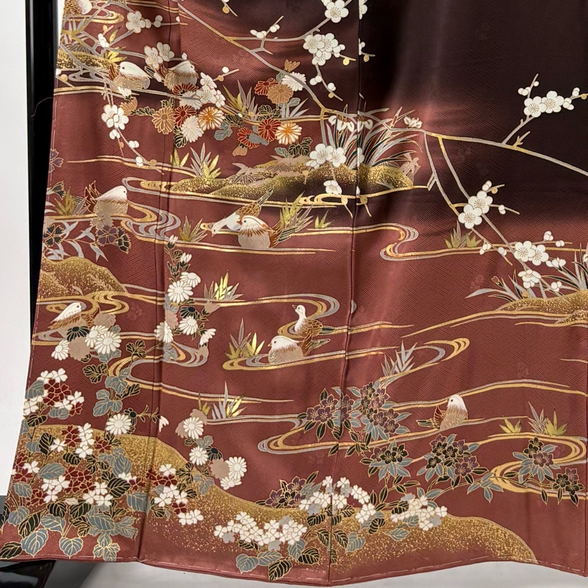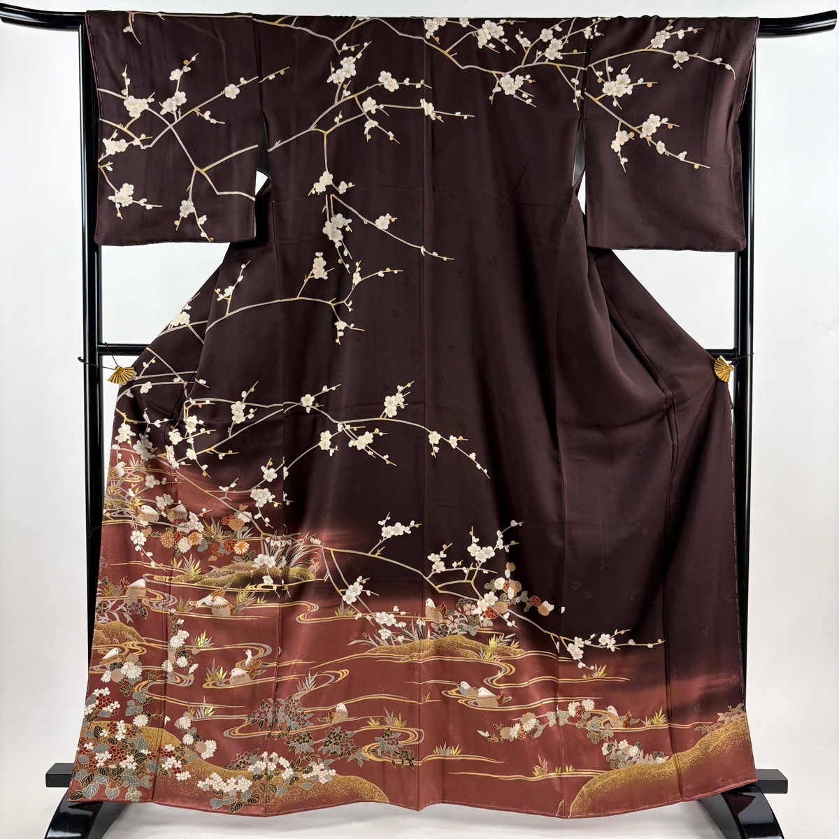 | 訪問着 秀品 鴛鴦 梅 金糸 金彩 焦茶色 袷 身丈164.5 裄丈66 M 正絹 【中古】 |