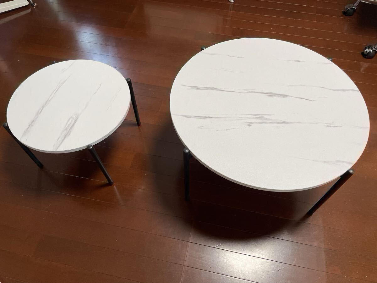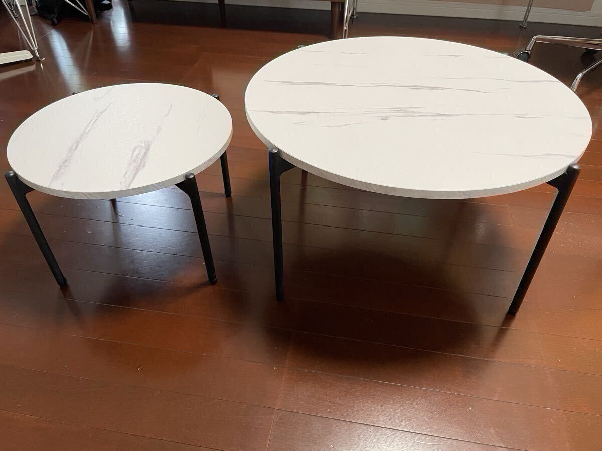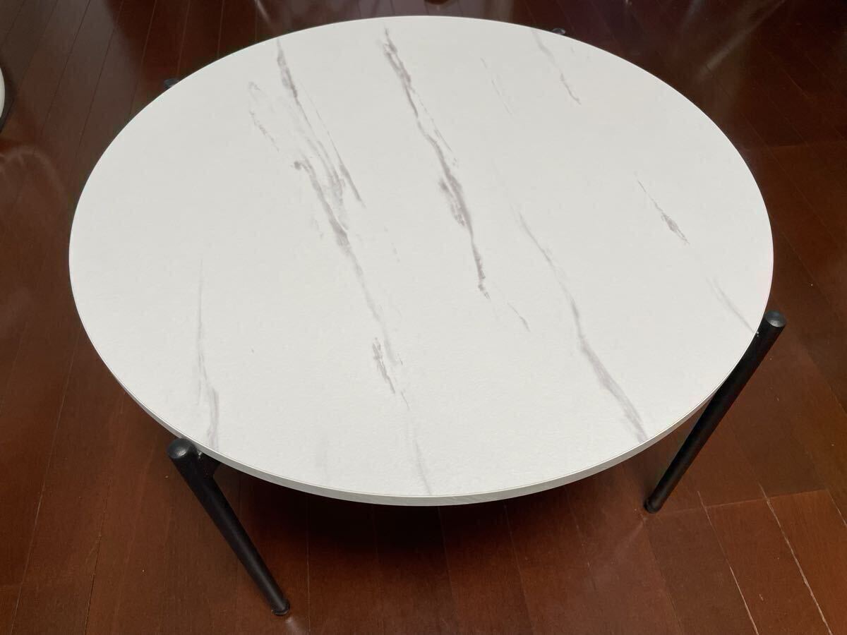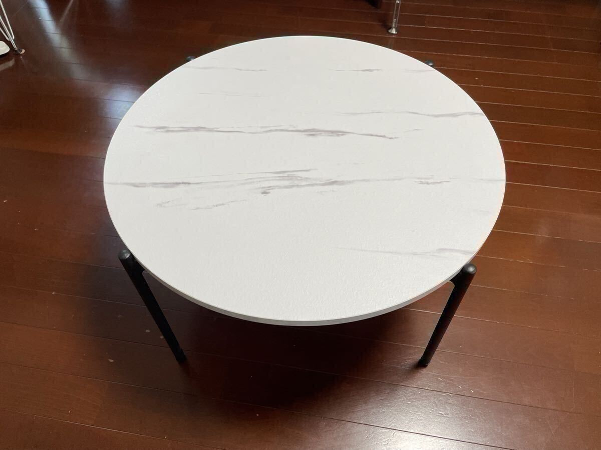 以下3年ほど前に購入した、円形ローテーブルです。天板はマーブルのデザインになってます。