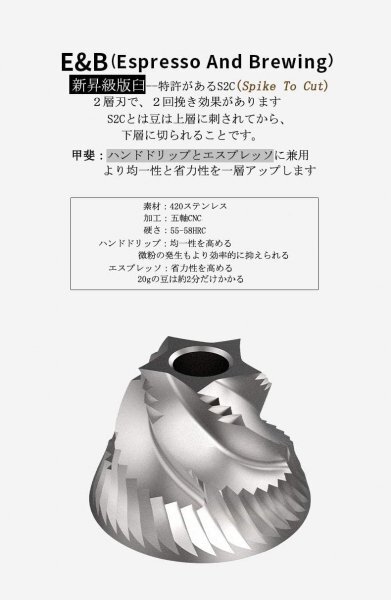 4.【優れた刃】:ハンドドリップとエスプレッソに兼用します。ハンドルドリップ:より均一性をアップして、微粉の発生も最小限に抑えます。エスプレッソ用:省力性をアップします。