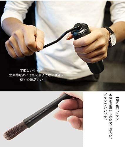 5.【省力性能】:ベアリング内蔵により手を離してもハンドルがしばらく回り続けるほど、スムーズな動きを実現。さらに、手の小さな方でも握りやすい直径45mmのコンパクトなボディ。表面のダイヤモンド・パターン加工によってグリップ力も高まり、非常に少ない力で軽々と挽くことが可能です。