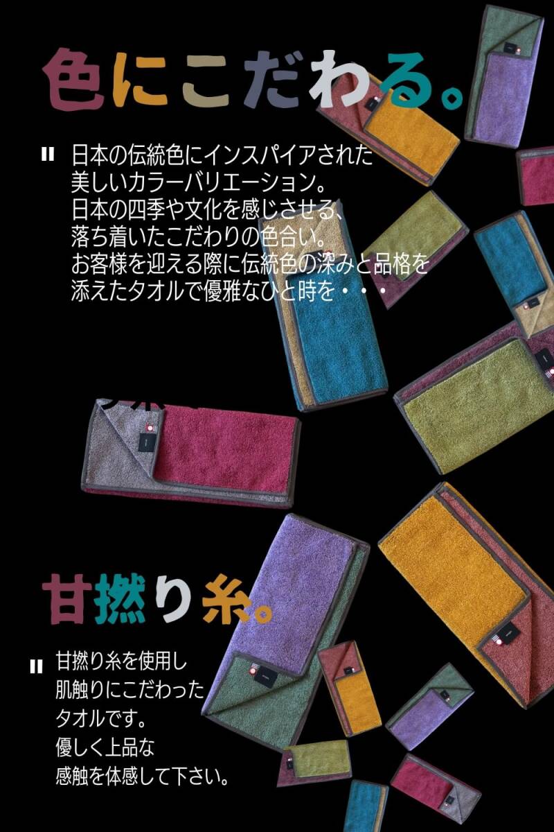 ■日本の伝統色をリバーシブルで取り入れたとても上品なタオルです。 肌触りはフワフワでまるで毛布に包まれているような温かい気分になります。 普段使いはもちろん、お客様用としてもぴったりのタオルです。 ひと味違うオシャレなタオル、揃えてみませんか。