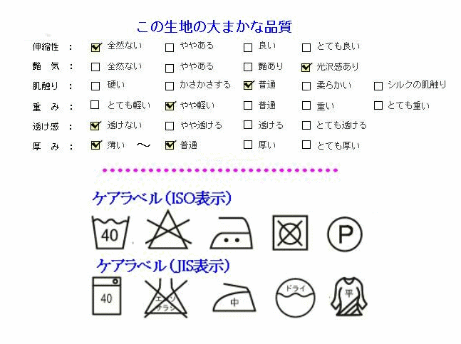 | 商品説明 | 光沢のある国産サテン生地 生地の持つ光沢感がとても上品に出ています ジャケットやドレスなどに最適 生地も染色も全て日本国内製造品です 幅115cm×長さ5m(延長可能) 価格は長さ5mの価格です 10mご入用の場合は入札数を「2」として下さい |
