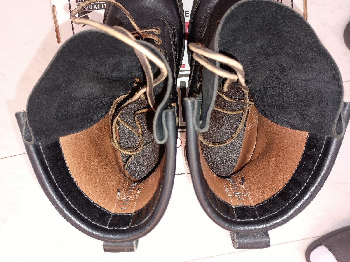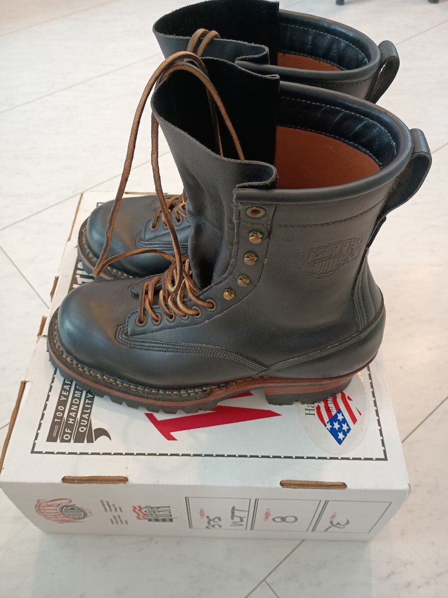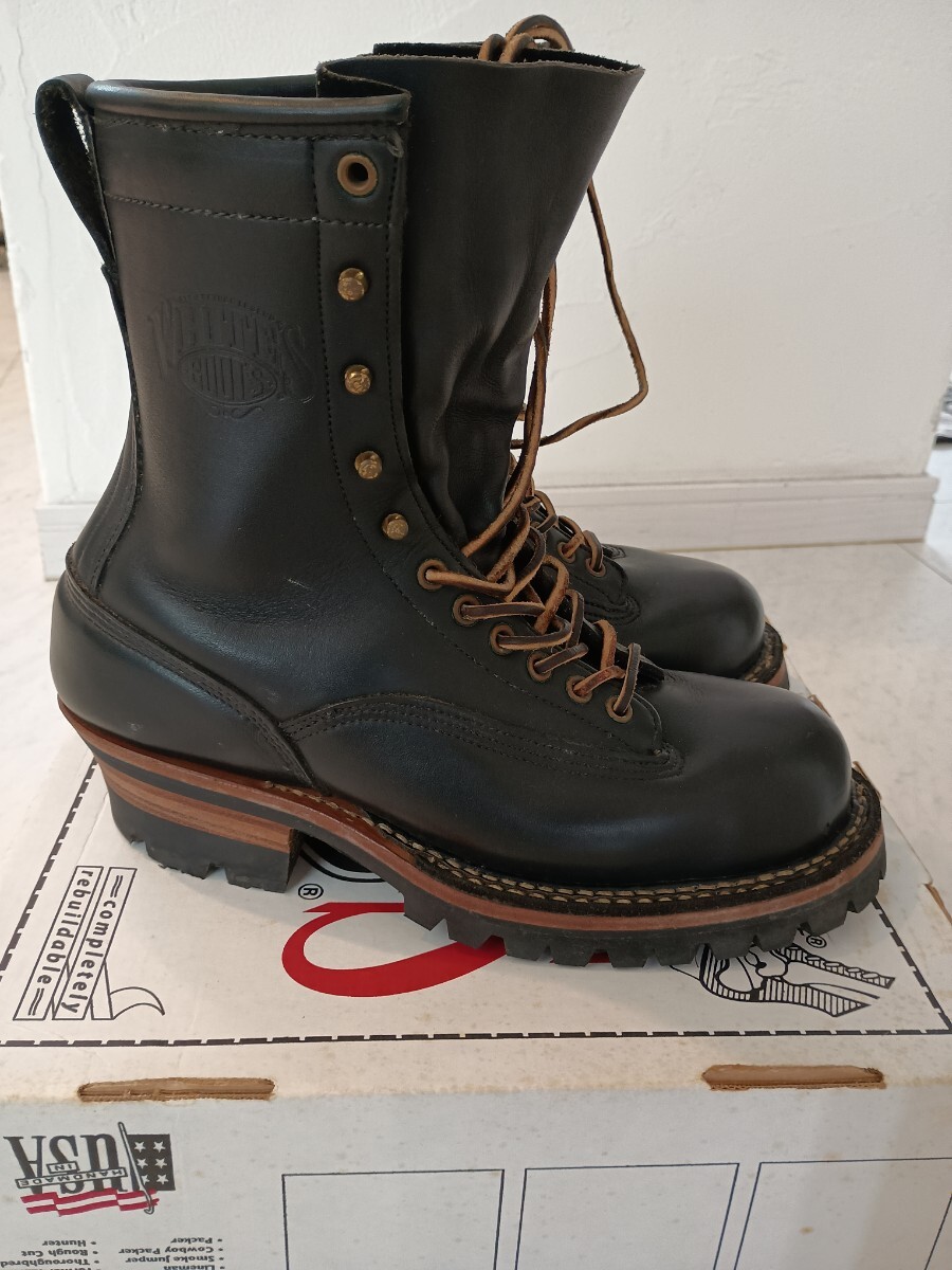 ブラックレザーのWHITES製ワークブーツ、耐久性とスタイルを兼ね備えた一足。