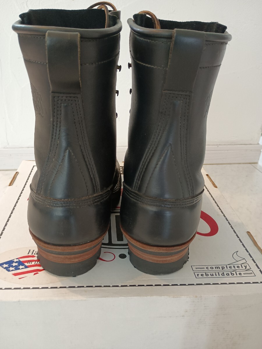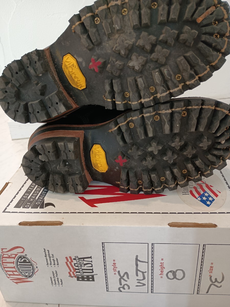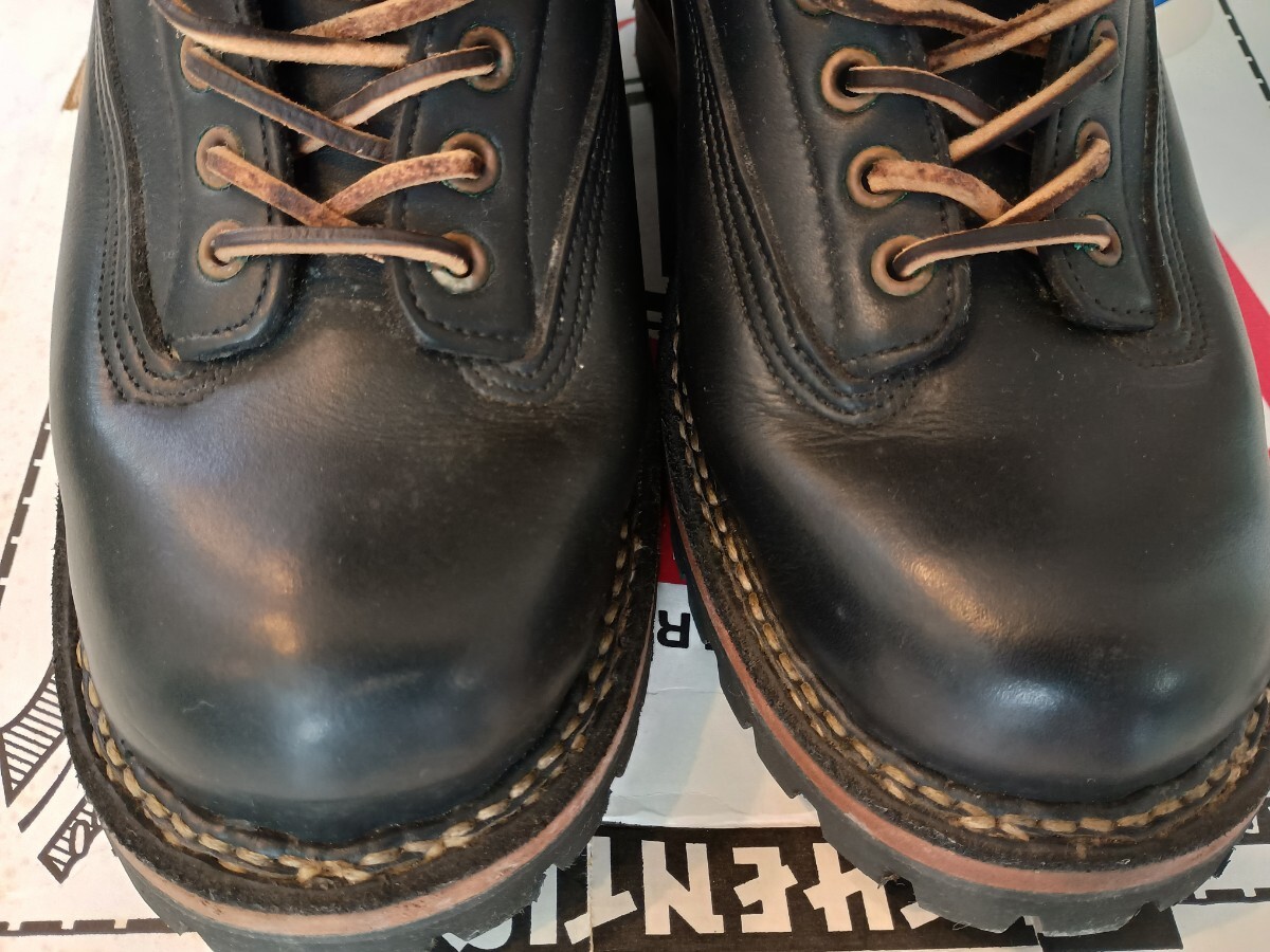 ブラックレザーのWHITES製ワークブーツ、耐久性とスタイルを兼ね備えた一足。