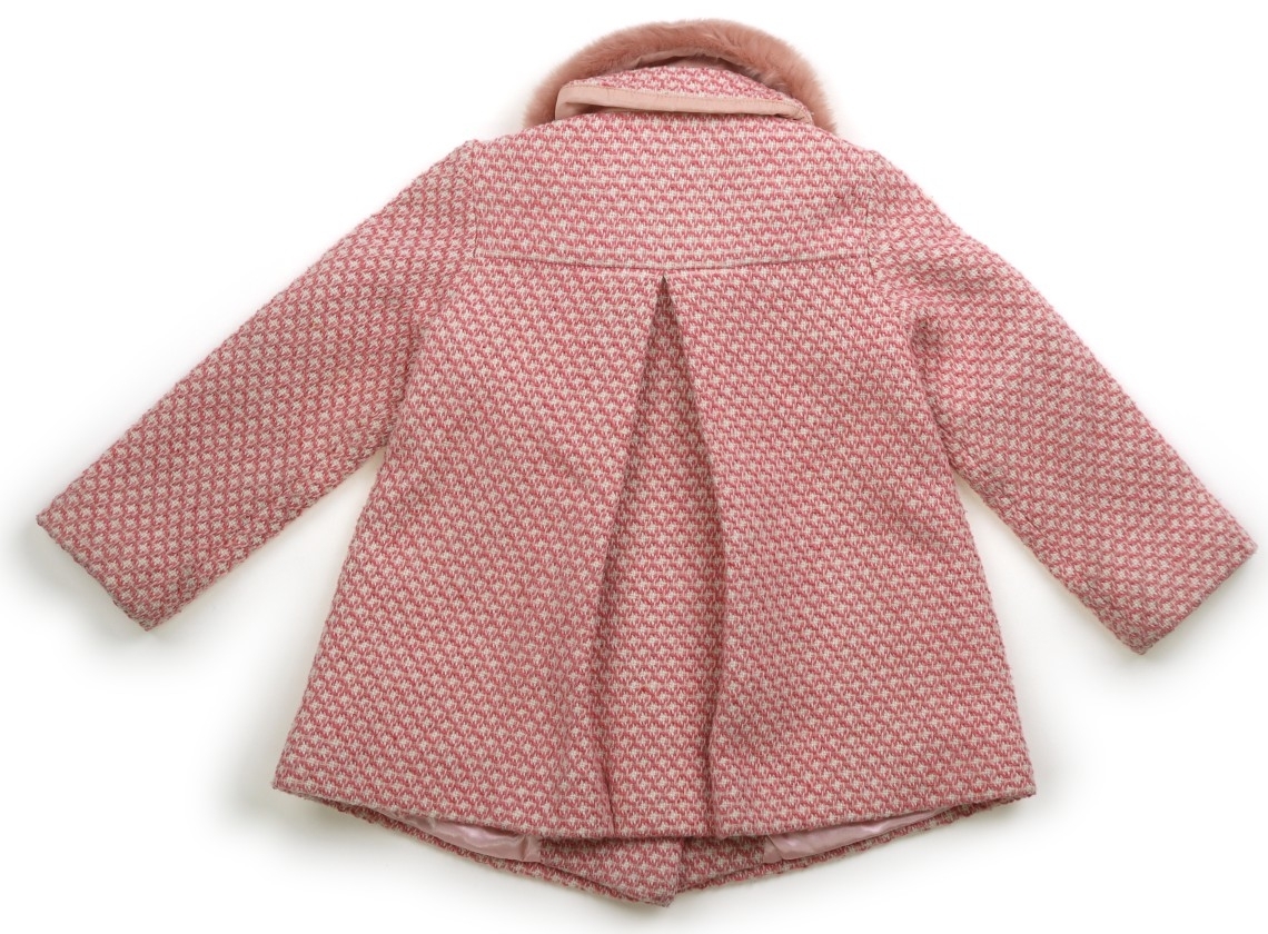 ポリエステル・ウール・他混合素材。裏地付き。襟のファーは着脱可能。実際のサイズ表記は、104cm。袖口が汚れています。毛羽立ち・洗いざらし感があります。