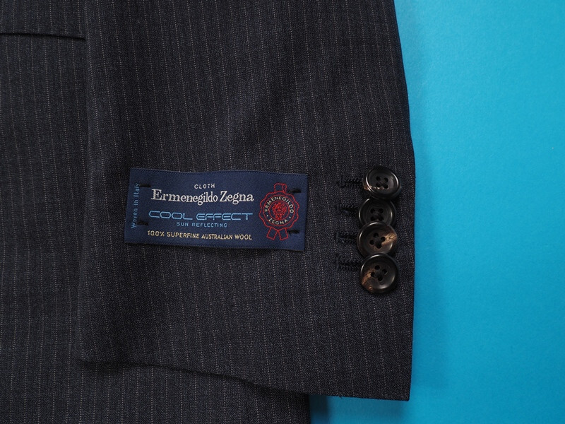 水牛釦、本切羽、AMFステッチ、ゼニアジャガード裏地、お台場仕立てなど、百貨店向けならではのオーダーメイド並みの最上級仕立てで仕上げられております。ファブリックはイタリアの最高級ファブリックメーカー、ゼニア社のウール100%生地を使用。イタリアのトリヴェロにあるエルメネジルドゼニア本社工場で最新テクノロジーを駆使して研究開発されたのがクールエフェクトです。特徴は生地の染色と仕上げの段階で”太陽光を反射”する特別なトリートメント加工を施していること。体感温度の上昇を抑制する効果があり、真夏の太陽の下でも快適なスーツスタイルが楽しめます。温暖化の影響で欧州でも猛暑日が発生する日が増えていますが、そんな夏にスーツをまとう男性のスタイルを変えた革新的な素材として多くの媒体に取り上げられました。