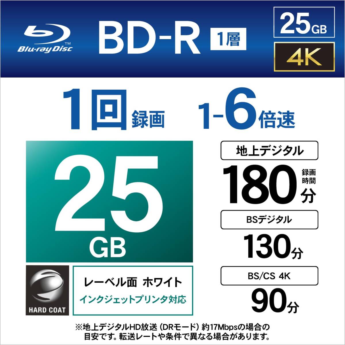 品種:録画用 BD-R(25GB) 1回録画用 録画時間:地デジ 180分 / BSデジタル130分 盤面印刷:○(ホワイト) / 範囲:22mm-118mm(ワイド) 倍速:1-6倍速,ケース:スピンドルケース,入り数:50枚 記憶容量:25GB(片面1層) インクジェットプリンタ対応ホワイトレーベル レーベル面ロゴ印字:あり