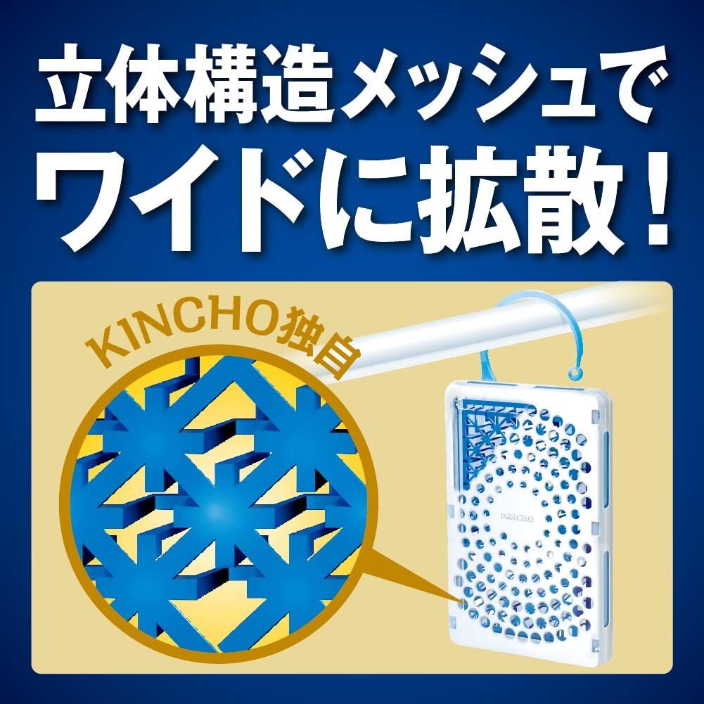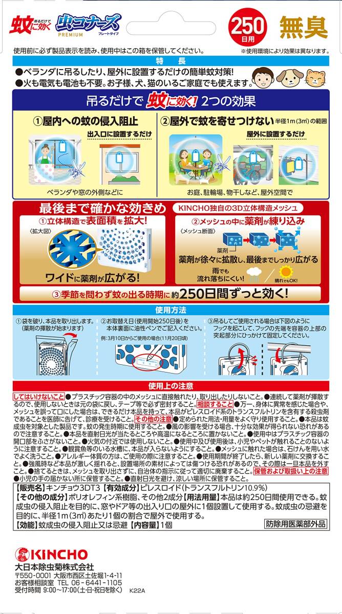説明 商品紹介 【特長】●ベランダに吊るしたり、屋外に設置するだけの簡単蚊対策! ●火も電気も電池も不要。お子様、犬、猫のいるご家庭でも使えます。 【効能】蚊成虫の侵入阻止又は忌避。<吊るだけで蚊に効く!2つの効果>(1)屋内への蚊の侵入阻止。出入口に設置するだけ。ベランダや窓の外側などに。(2)屋外で蚊を寄せつけない(半径1m(3m2)の範囲)屋外に設置するだけ。お庭、駐輪場、物干しなど、屋外空間で。 <最後まで確かな効きめKINCHO独自の3D立体構造メッシュ> (1)立体構造で表面積を拡大!ワイドに薬剤が広がる! (2)メッシュの中に薬剤が練り込み。薬剤が徐々に拡散し、最後までしっかり広がる。雨でも流れ落ちにくい!/晴れでもOK! (3)季節を問わず蚊の出る時期に約250日間ずっと効く!お得な2個パック。無臭。 原材料・成分 【有効成分】ピレスロイド(トランスフルトリン10.9%)【その他の成分】ポリオレフィン系樹脂、その他2成分 使用方法 【用法用量】本品は約250日間使用できる。蚊成虫の侵入阻止を目的に、窓やドア等の出入り口の屋外に1個設置して使用する。蚊成虫の忌避を目的に、半径1m(3m2)あたり1個の割合で屋外で使用する。 【使用方法】(1)袋を破り、本品を取り出します。(薬剤の揮散が始まります)(2)お取替え日(使用開始250日後)を本体裏面に油性ペンでご記入ください。例:3月10日からご使用の場合(11月20日頃)(3)吊るしてご使用される場合は下図のようにフックを起こして、フックの先端を容器の上部の突起部分にひっかけて固定してください。 安全警告 ※使用環境により効果が異なりますので、裏面表示をよくお読みください。使用前に必ず製品表示を読み、使用中はこの箱を保管してください。 【使用上の注意】 <してはいけないこと> ●プラスチック容器の中のメッシュに直接触れたり、取り出したりしないこと。 ●連続して薬剤が揮散するので、使用しないときは元の袋に戻し、テープ等で必ず密封すること。 <相談すること> ●万一、身体に異常を感じた場合や、メッシュを誤って口にした場合は、できるだけ本品を持って、本品がピレスロイド系のトランスフルトリンを含有する殺虫剤であることを医師に告げて、診療を受けること。 <その他の注意> ●定められた用法・用量をよく守り使用すること。 ●本品は蚊成虫を対象とした製品です。蚊の発生時期に使用すること。 ●風の影響を受ける場合、十分な効果が得られない恐れがあるので注意すること。 ●本品を直射日光が当たるところや高温になるところに置かないこと。 ●使用中はプラスチック容器の開口部をふさがないこと。 ●火気の付近では使用しないこと。 ●使用中及び使用後は、小児やペットが触れることのないように注意すること。 ●観賞魚等のいる水槽に、本品が入らないようにすること。 ●メッシュに触れた場合は、石けんを用い水でよく洗うこと。 ●アレルギー体質の方は、ご使用の際に注意すること。 ●使用期間が終了したら、新しい薬剤に交換すること。 ●強風時など本品が激しく揺れると、設置場所の素材によっては傷つける恐れがあるので、その際は一旦本品を外すこと。 ●捨てるときは、メッシュを取り出さずに、自治体の指示に従って適切に廃棄すること。 <保管および取扱い上の注意> ●小児の手の届かない所に保管すること。 ●直射日光を避け、涼しい場所に保管すること。
