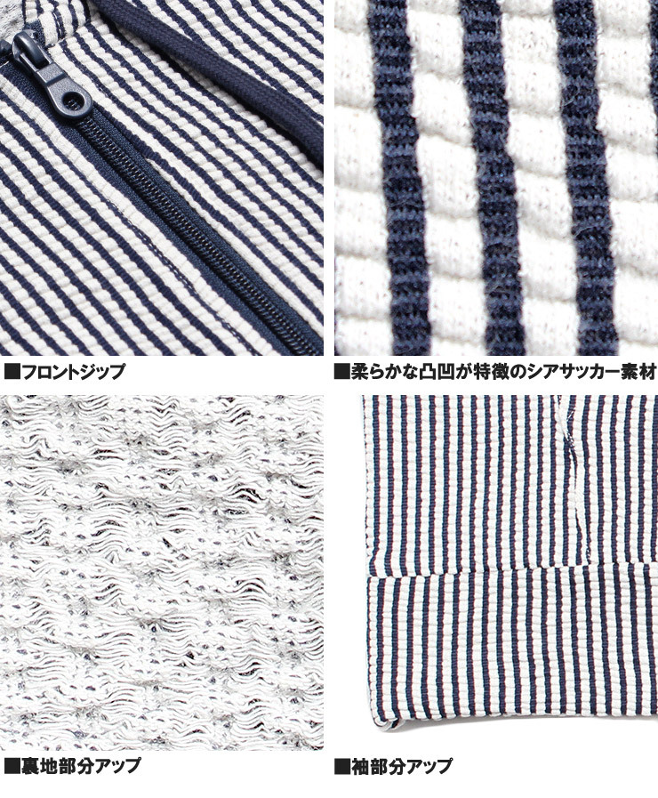 | 商品説明 | 軽くて通気性が良い表面の凹凸が特徴のシアサッカー素材を落とし込んだ半袖ジップアップパーカー。 |
