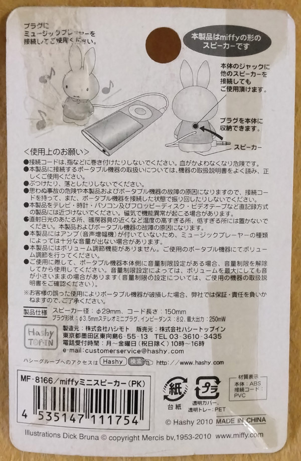 +++++++++++++++++++++ ◆送料◆ 定形外郵便 290円 +++++++++++++++++++++ Hashy(ハシー)製の可愛いミッフィー(miffy)ミニスピーカーです。 ピンクの洋服を着たミッフィー型のスピーカー。電池不要で3.5mmステレオミニプラグに直接接続可能な音楽プレーヤー等に接続してご利用いただけます。 ・接続端子:3.5mmステレオミニプラグ ・スピーカー径:約29mm ・コード長:約150mm ・最大出力:約250mW ・カラー:ピンク ・メーカー:Hashy TOPIN ----------------------- ◆状態◆ ・未使用品 ・パッケージにセロテープ止め・跡、等があります。 ・自宅保管品のため細かい点を気にされる方はご遠慮ください ・写真の品を現状渡しになります ----------------------- ◆ご面倒ですが【自己紹介欄】は必ずご覧ください。 |