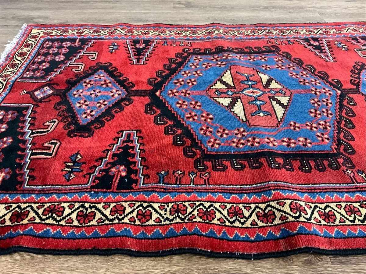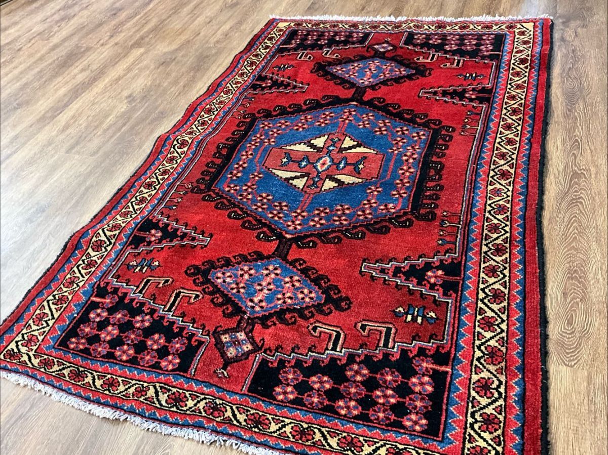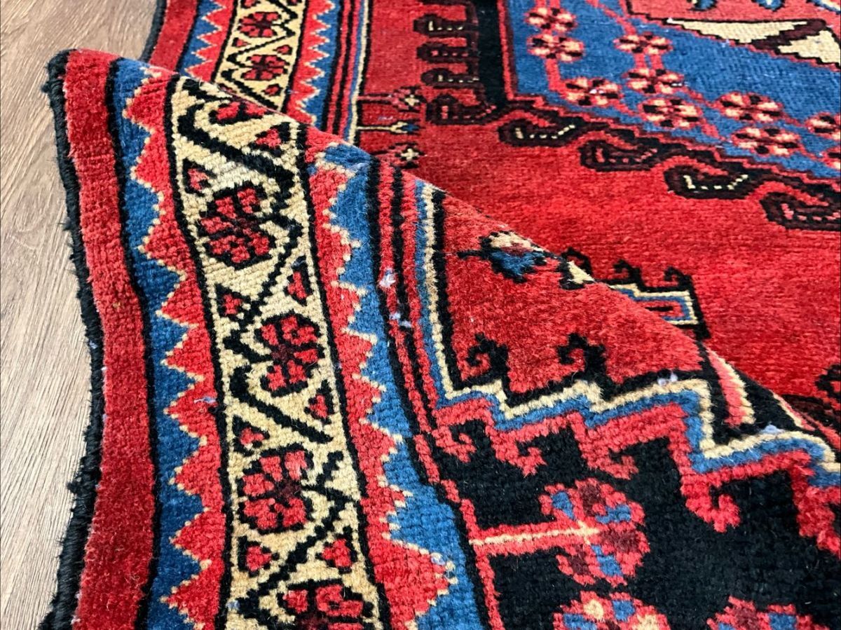 ★手織りの味わい★中央などに経年による擦れ、若干の波打ちがございます。手織りの味わいを感じる細かく目の詰まった丈夫な織り、経年により低くなったパイルはさっぱりとした質感、バクティアリ絨毯ならではの打ち込みのしっかりとした重厚な作り、これからも長く御愛用いただける素晴らしい一枚です。(画像をご確認下さい。) (ハンドメイド特有の歪みがございます。)
