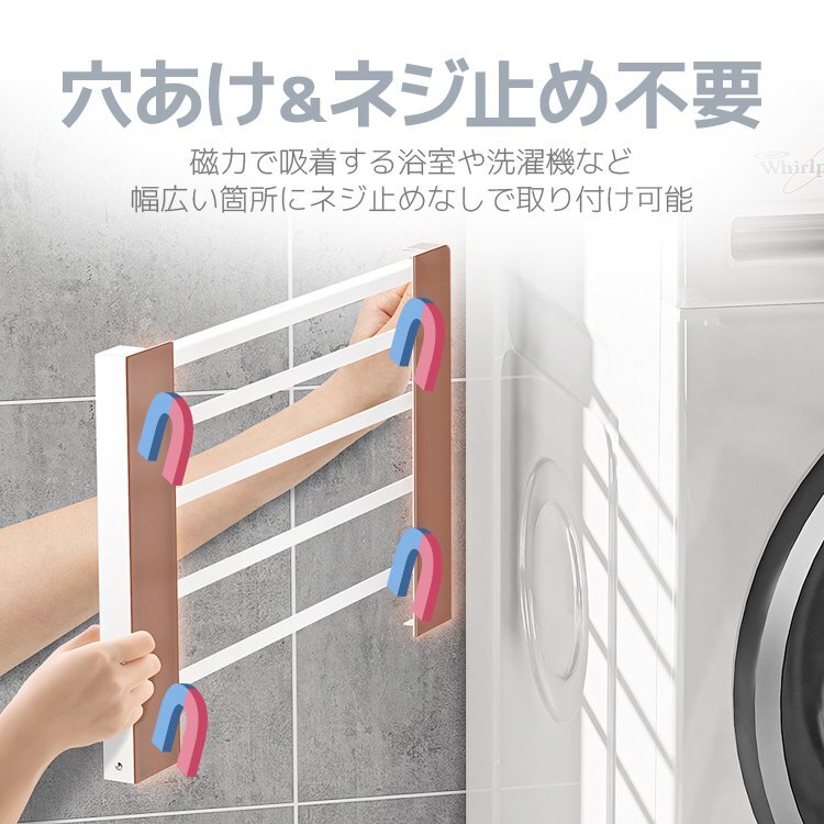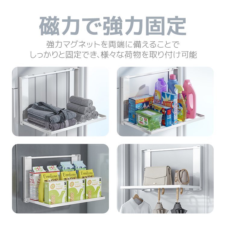 強力磁石を備え、洗濯機や浴室の壁、冷蔵庫横など、磁力で吸着する滑らかな箇所に手軽に取り付けてラックを拡張することができます。