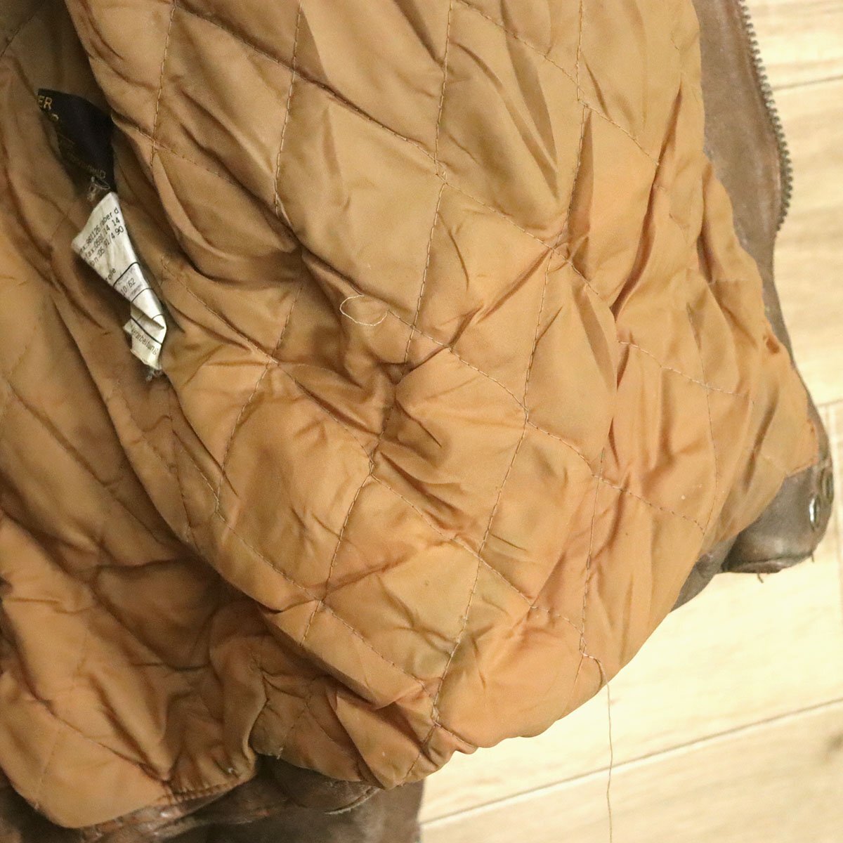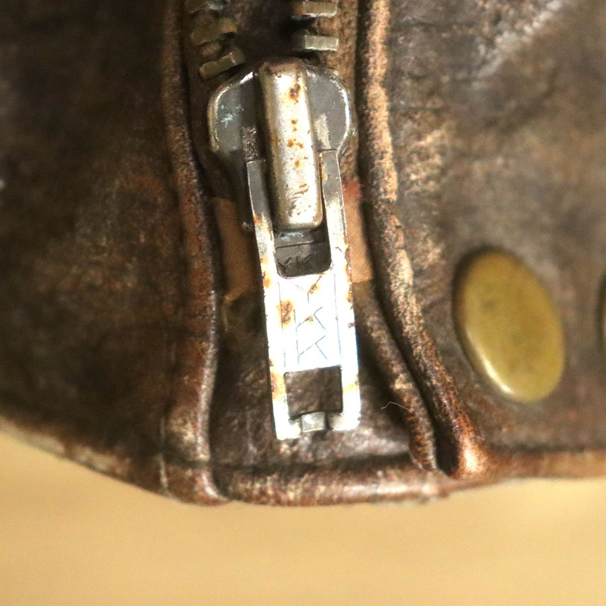 中古品です。使用感があります。全体的に経年による擦れと薄汚れ、左胸ポケットジッパーのスライダーが破損のため革紐がついています。