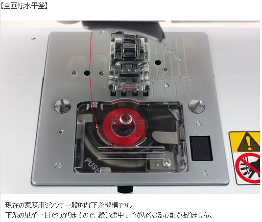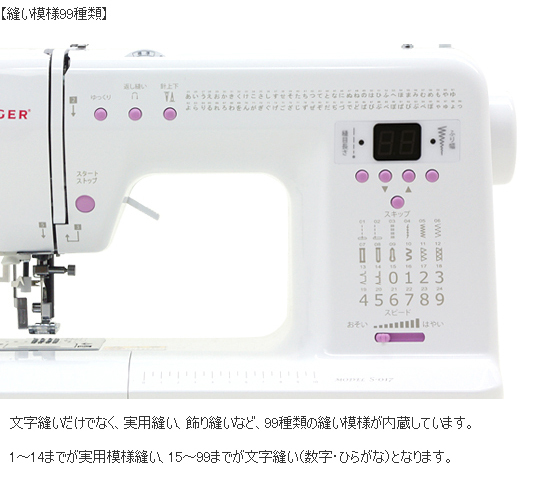 文字縫い(ひらがな、数字)・実用縫い合計99種類、簡単糸通し、標準糸調子、ゆっくり縫いボタン、針上下ボタン、全回転水平釜、LEDランプ、5つボタンの簡単操作パネル、フリーアーム(筒縫い)、メジャープリント、ソーイングスペース