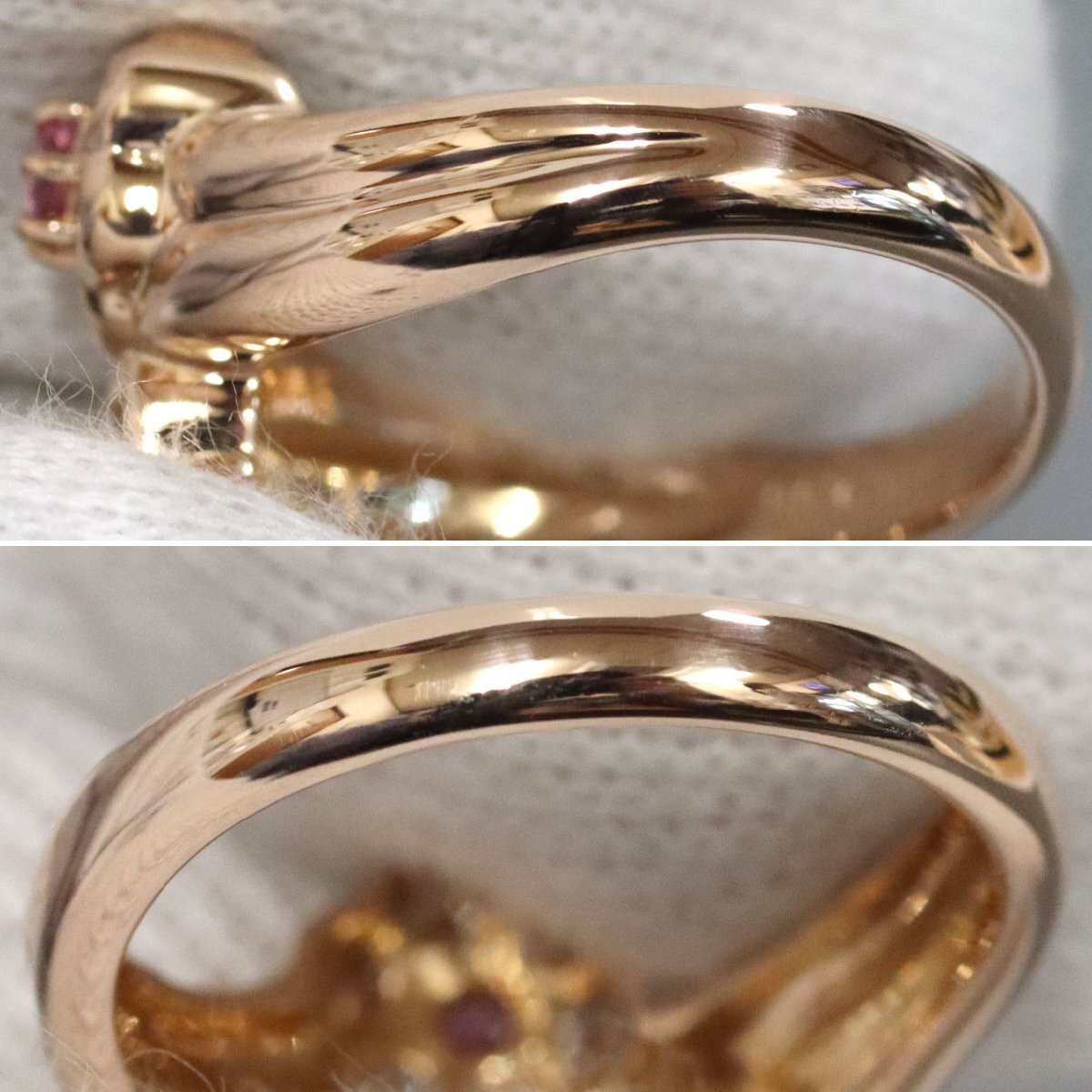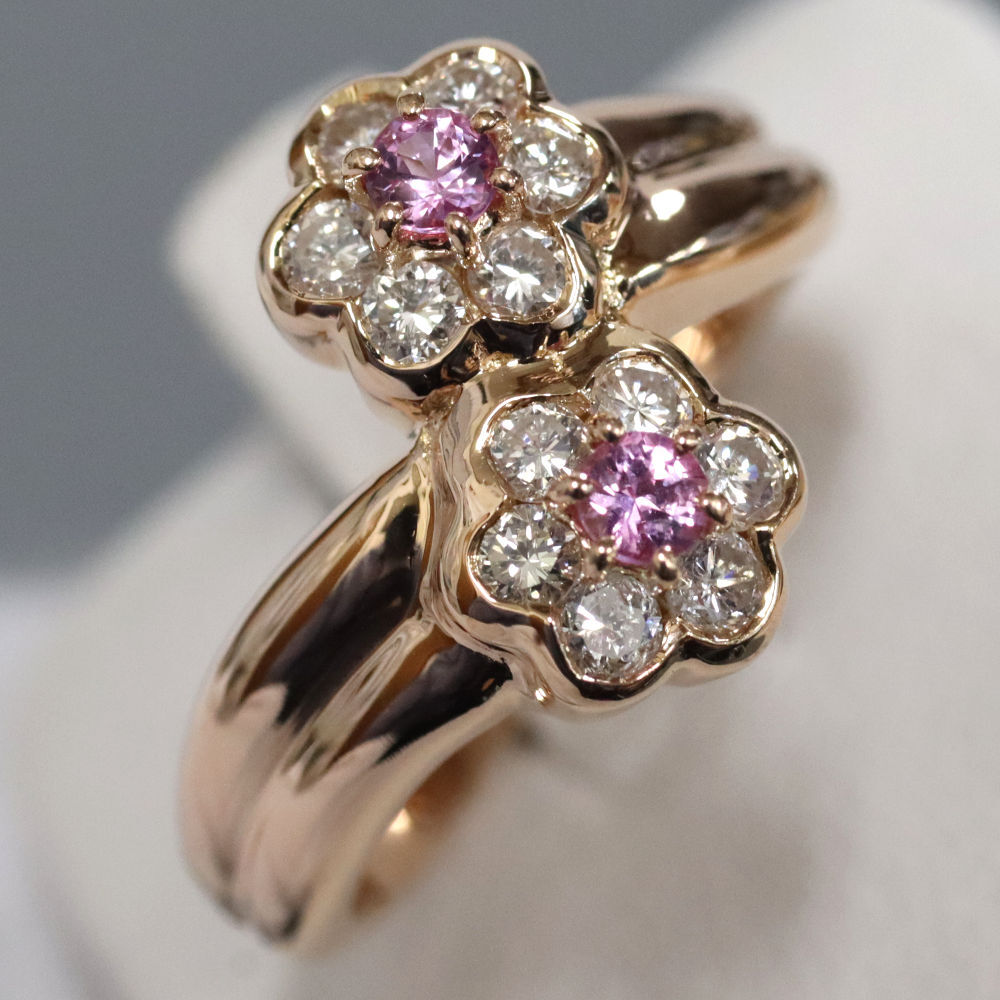 K18PGピンクサファイアダイヤモンドリングの中古品です。 フラワーモチーフの可愛らしいデザインです。 ダイヤモンドは、インクルージョンはありますが、輝きがあります。 地金に小傷があります。 ピンクゴールドのため、当店ではサイズ直しができないお品物です。