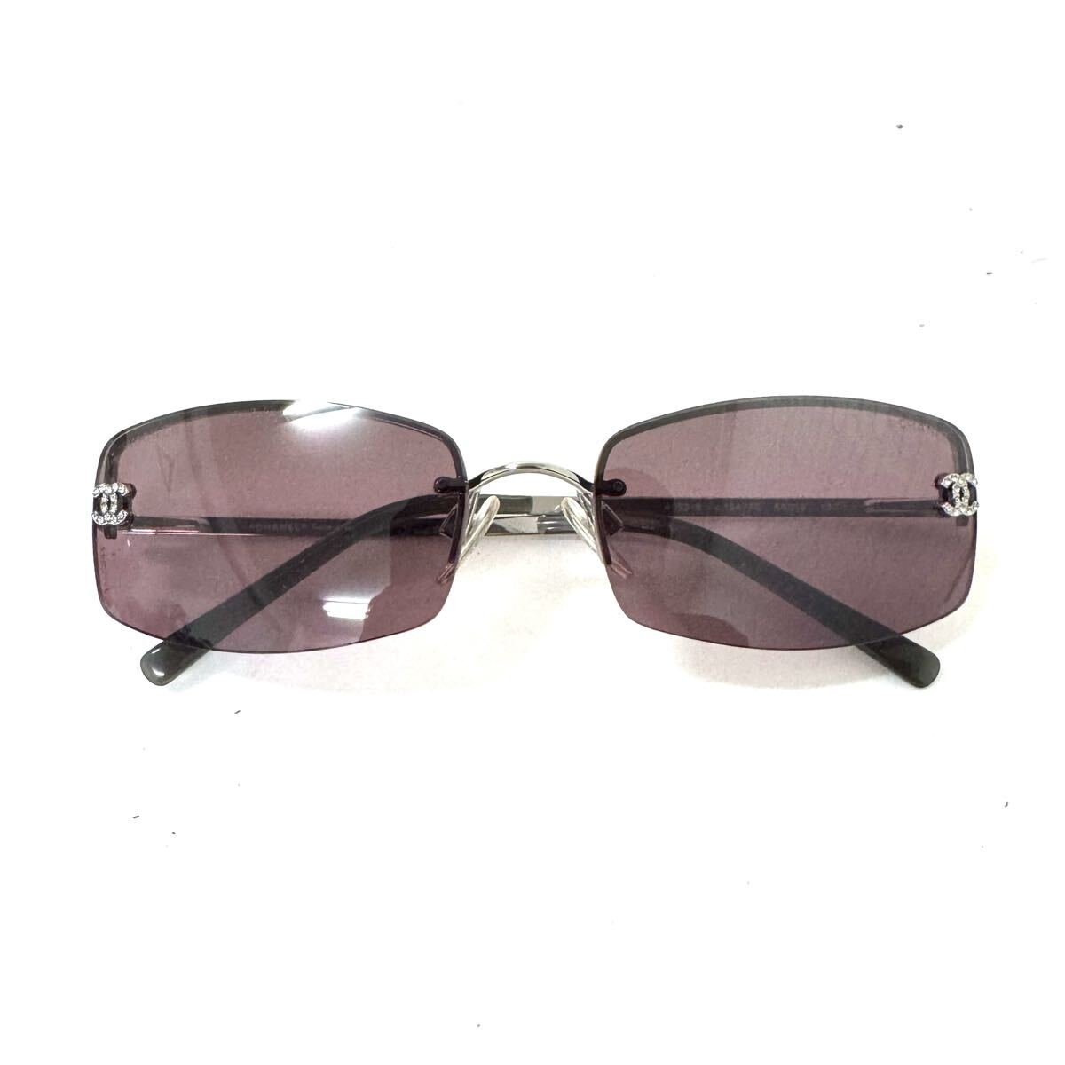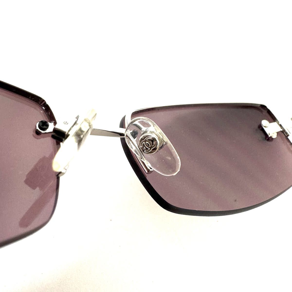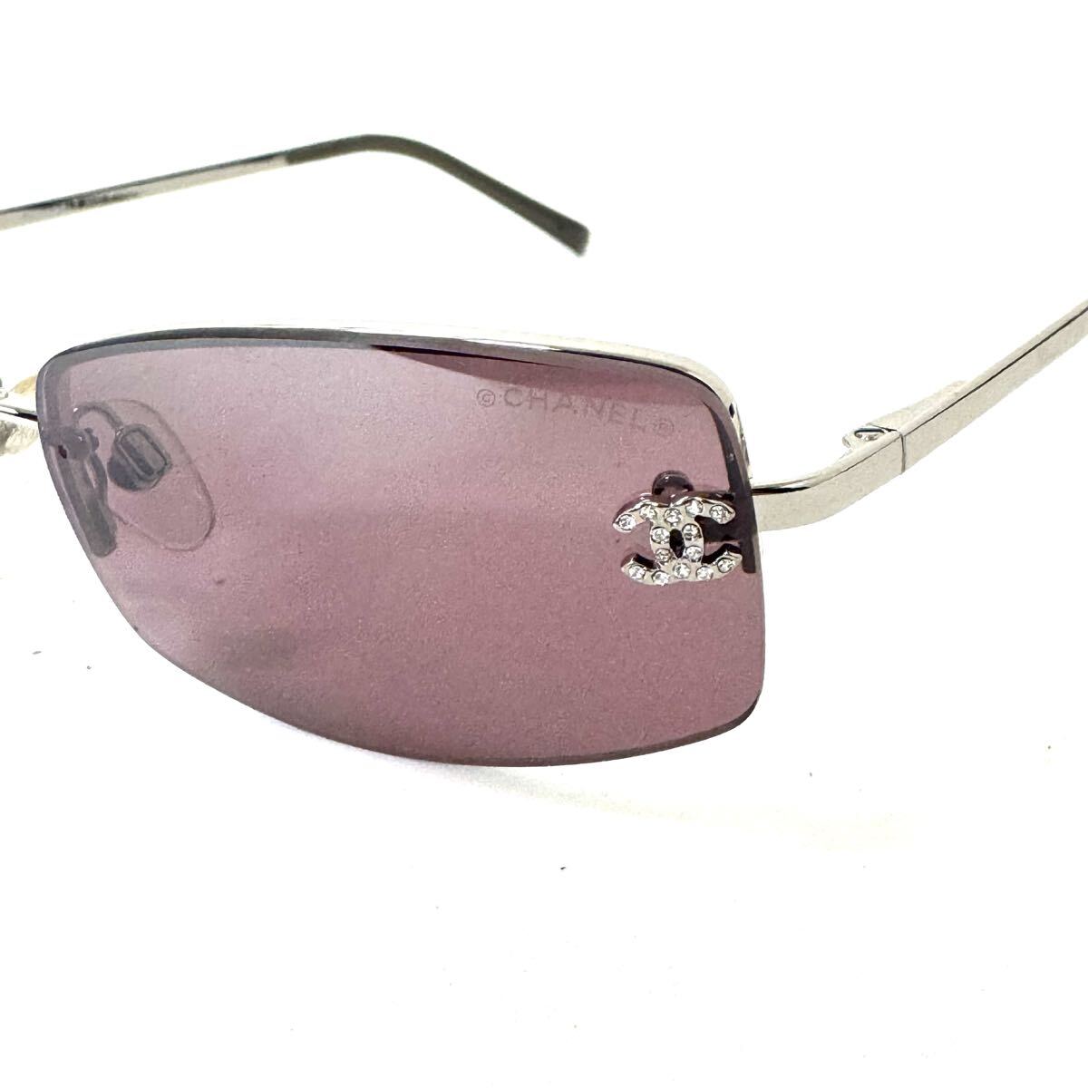 パープルレンズにフレームはシルバーのリムレスのサングラスです。ココマークにはラインストーンがついております。