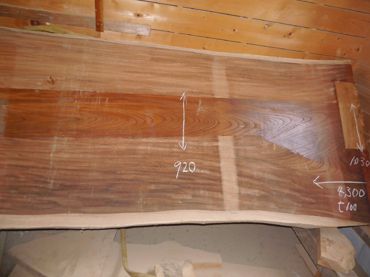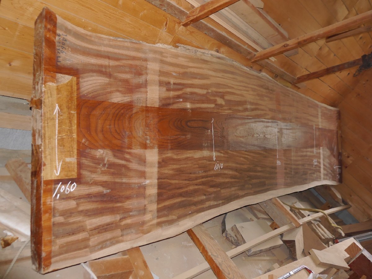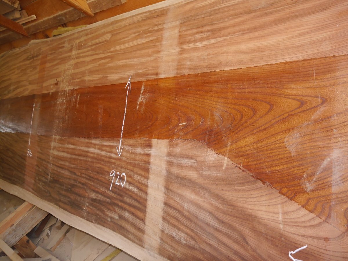 ケヤキ一枚板テーブル・部分的にシラタが擦れ無い状態ですので、赤身だけの仕上がりに、させていただきます。サイズ(約)長さ4、2m 幅105~920~103センチ 厚さ10センチ(加工後80ミリ前後 直線加工幅赤身90センチ)別途、外周の仕上げを、甲丸(直線)にすると、より上品になりますが、手間が多く掛かりますので、5万円ほど、価格が上がる事をご承知下さい。国産ケヤキは、傷になりにくい硬さと、木目の綺麗さから、テーブルには、一番の良材と言われています。力強い縄杢の板です。天然オイル仕上げると、より木目が引き立ちます(リボス社アルドボス)お手入れ用オイル・サービス木表無節の板です。これだけの長さと幅で節の無い物は、価値が有ります。テーブルが長いので、鉄製のT型脚の高さ調整の付いた物を、3個用意するか、木製脚を作るのかを、ご相談下さい。特別大きな物なので、搬送経路を確認下さい。また、2階以上に上げる作業などは、別途請求させていただきます。また、一枚板テーブルは高価な物ですし、原板の写真ですので、現物確認をおすすめしています。なお、作業場に併設した店舗でも販売していますので、品切れの際は何卒ご容赦ください。