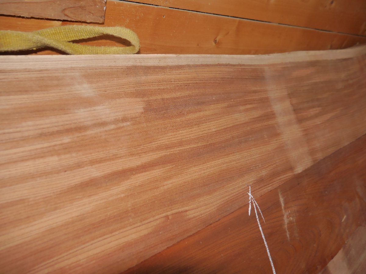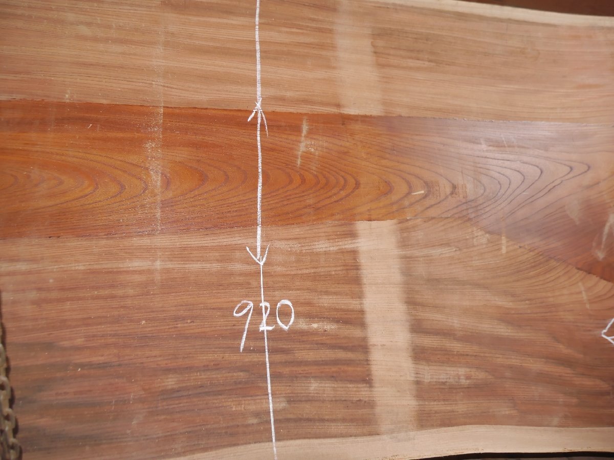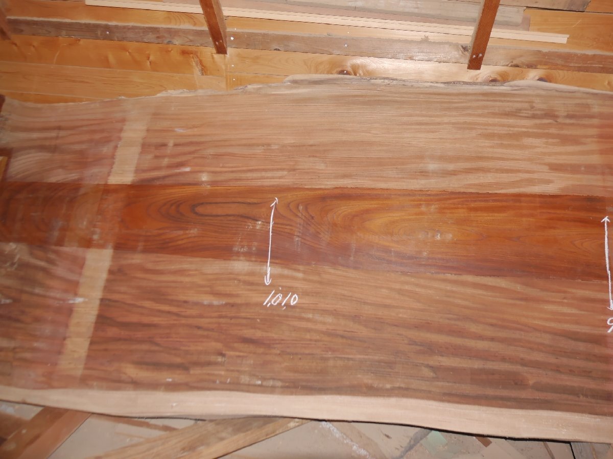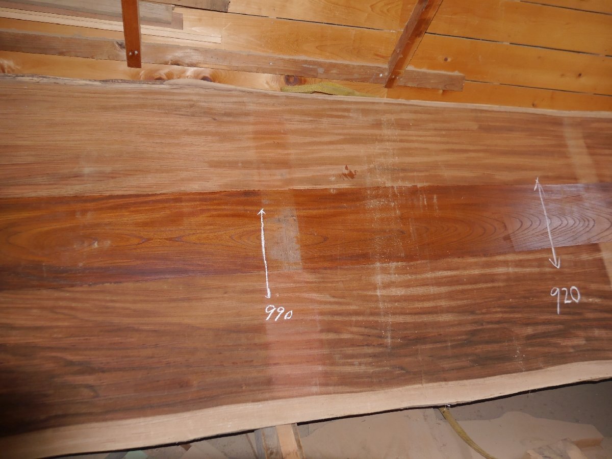ケヤキ一枚板テーブル・部分的にシラタが擦れ無い状態ですので、赤身だけの仕上がりに、させていただきます。サイズ(約)長さ4、2m 幅105~920~103センチ 厚さ10センチ(加工後80ミリ前後 直線加工幅赤身90センチ)別途、外周の仕上げを、甲丸(直線)にすると、より上品になりますが、手間が多く掛かりますので、5万円ほど、価格が上がる事をご承知下さい。国産ケヤキは、傷になりにくい硬さと、木目の綺麗さから、テーブルには、一番の良材と言われています。力強い縄杢の板です。天然オイル仕上げると、より木目が引き立ちます(リボス社アルドボス)お手入れ用オイル・サービス木表無節の板です。これだけの長さと幅で節の無い物は、価値が有ります。テーブルが長いので、鉄製のT型脚の高さ調整の付いた物を、3個用意するか、木製脚を作るのかを、ご相談下さい。特別大きな物なので、搬送経路を確認下さい。また、2階以上に上げる作業などは、別途請求させていただきます。また、一枚板テーブルは高価な物ですし、原板の写真ですので、現物確認をおすすめしています。なお、作業場に併設した店舗でも販売していますので、品切れの際は何卒ご容赦ください。