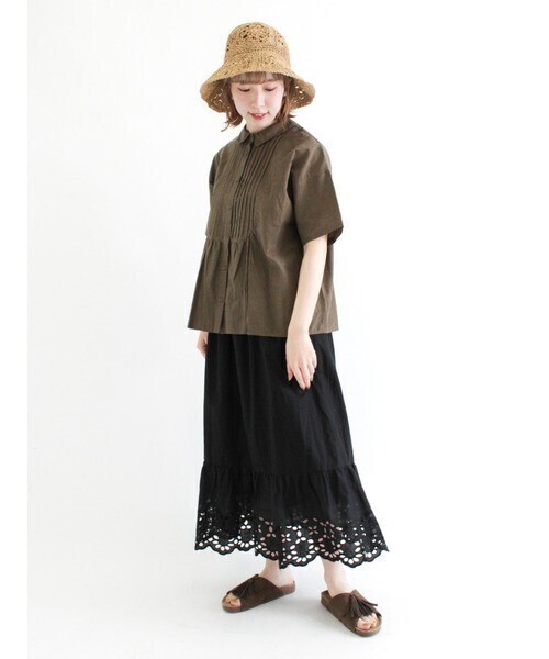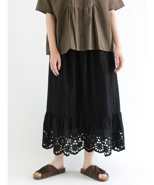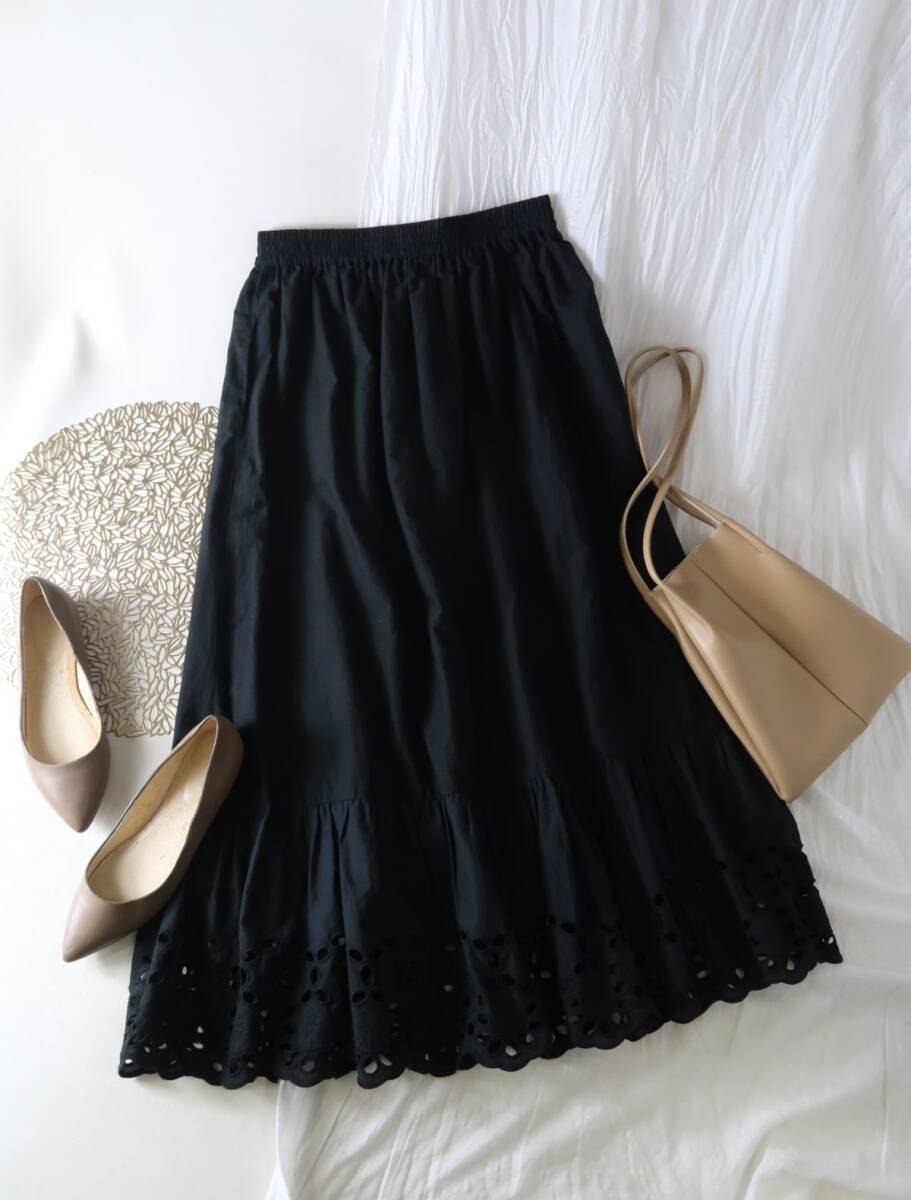 花柄刺繍×裾スカラップのフェミニンディテールがポイントのスカート。しっかりとした上品なハリ感と、繊細に寄せたギャザー切替えのふんわりとした揺れ感が、華やぎの印象へと導きます。綿100%なので肌ざわりも良く、ウエストは総ゴム仕様なので快適な穿き心地を実現。ワントーンカラーで仕上げた落ちついたデザインはコーデに馴染みやすく、オンオフ問わずに愛用できます。