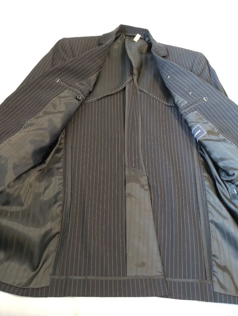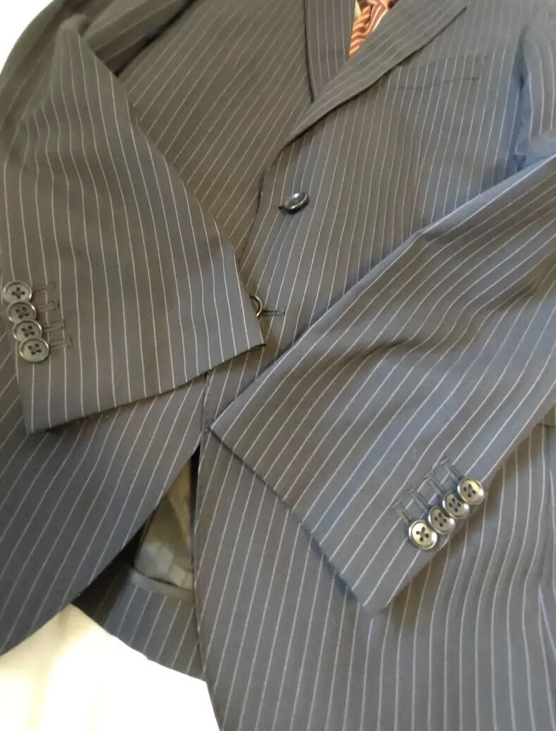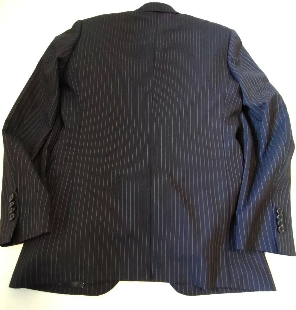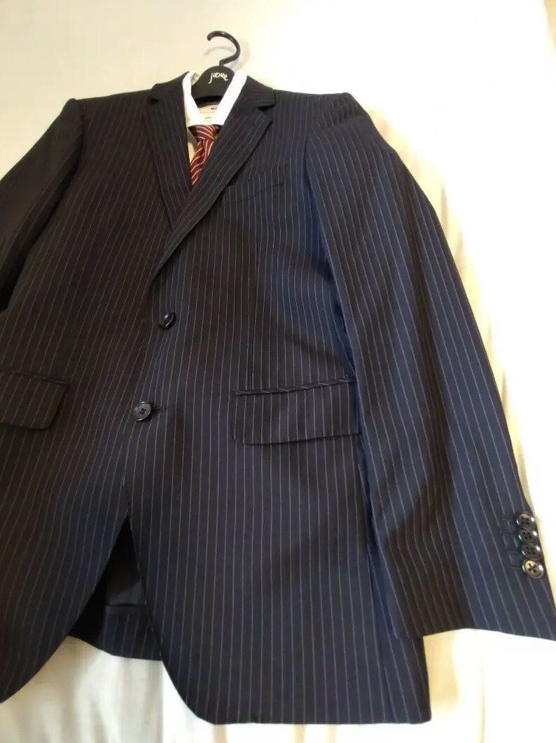 ご覧いただきありがとうございます。ビジネス、フォーマル幅広いシーンで着用できる黒に近い濃いめのネイビーストライプ柄