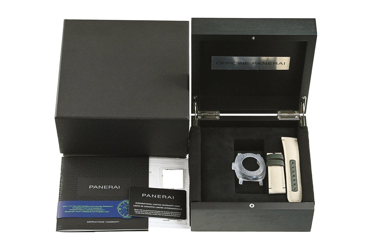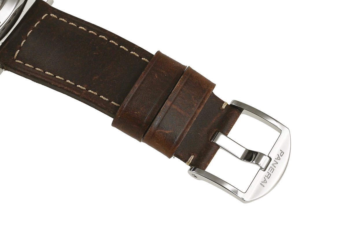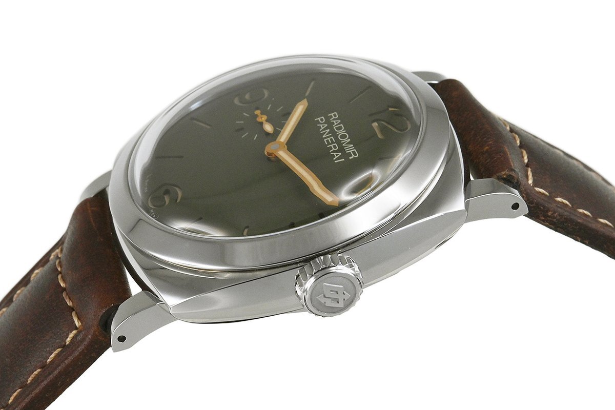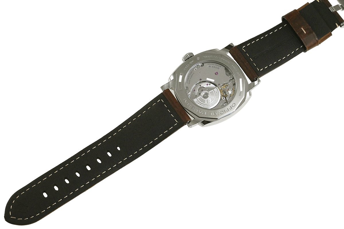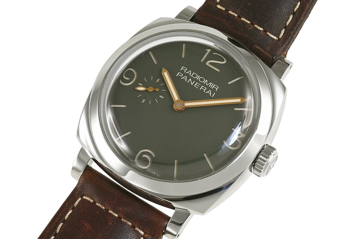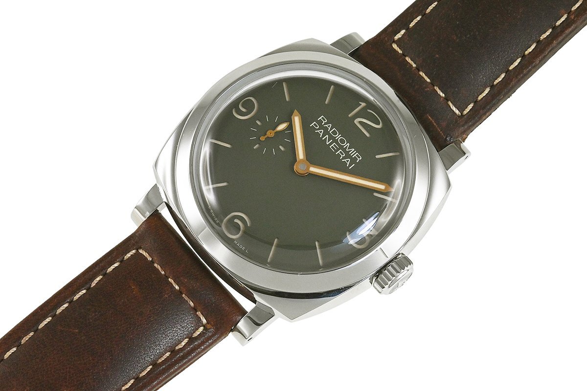 【コメント】 クッションケースにワイヤーラグが特徴の人気モデル「ラジオミール」。ケース径45mm、ミリタリーグリーンダイアルが特徴的な自動巻モデルです。パネライ自社製キャリバーP.4000を搭載、裏蓋シースルーバックとなっています。使用に伴う若干の軽い擦りキズはありますが、目立つ様な深いキズはありません。革ベルトは追加で穴が内側に1つにあけられており、軽い尾錠の留め痕はありますが目立つ汚れ等なくキレイな状態です。 2021年1月に購入品で、オーバーホール歴は分かりませんが、現在精度は平置きで日差+1秒程です。