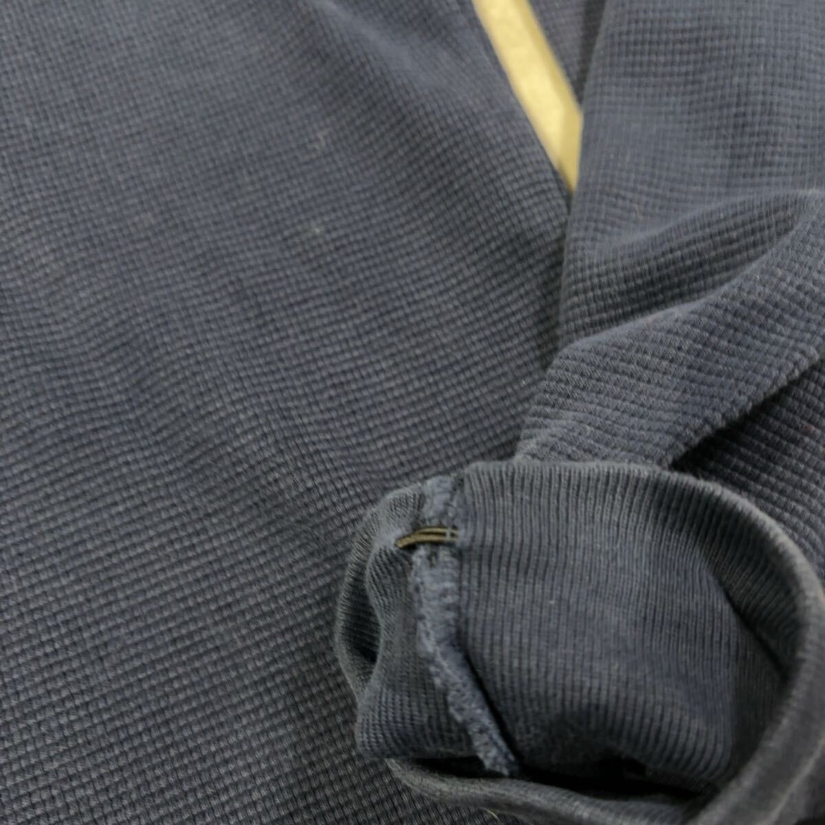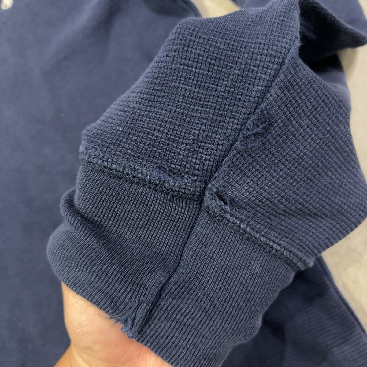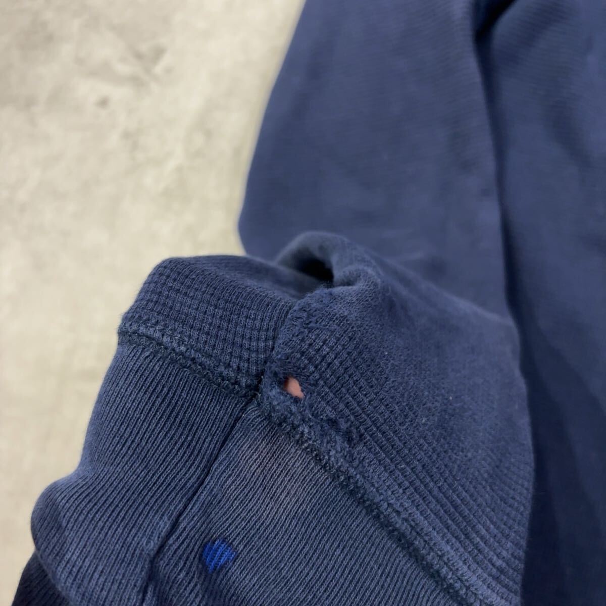 袖口にダメージあり。スレた穴と色抜けに色を足したような汚れシミ、内側にゴムがはいっていますが古着購入時からでしたが、おそらく自分でゴム入れられてる感じ。袖のやぶれやシミ?色抜け?以外は古着らしい色褪せでまだまだ着用可能。全体的に着用感のご理解がある方で宜しくお願いします!