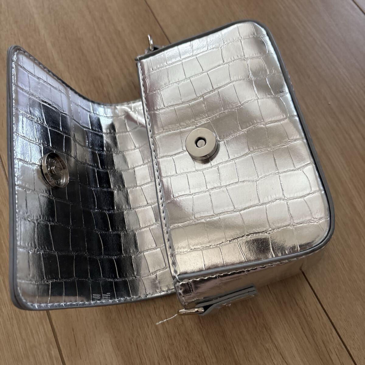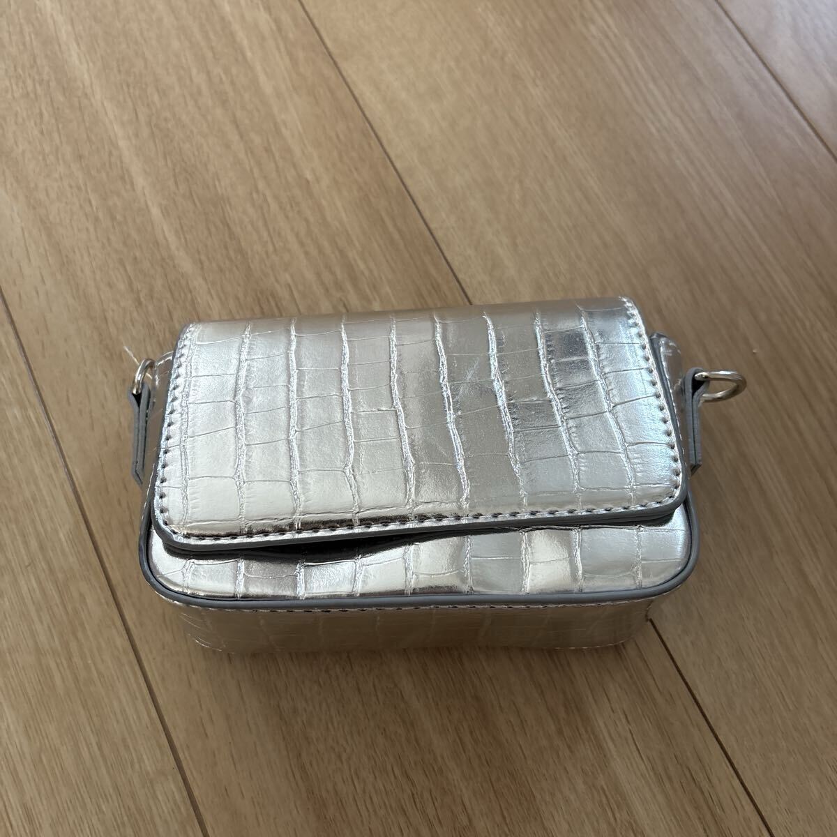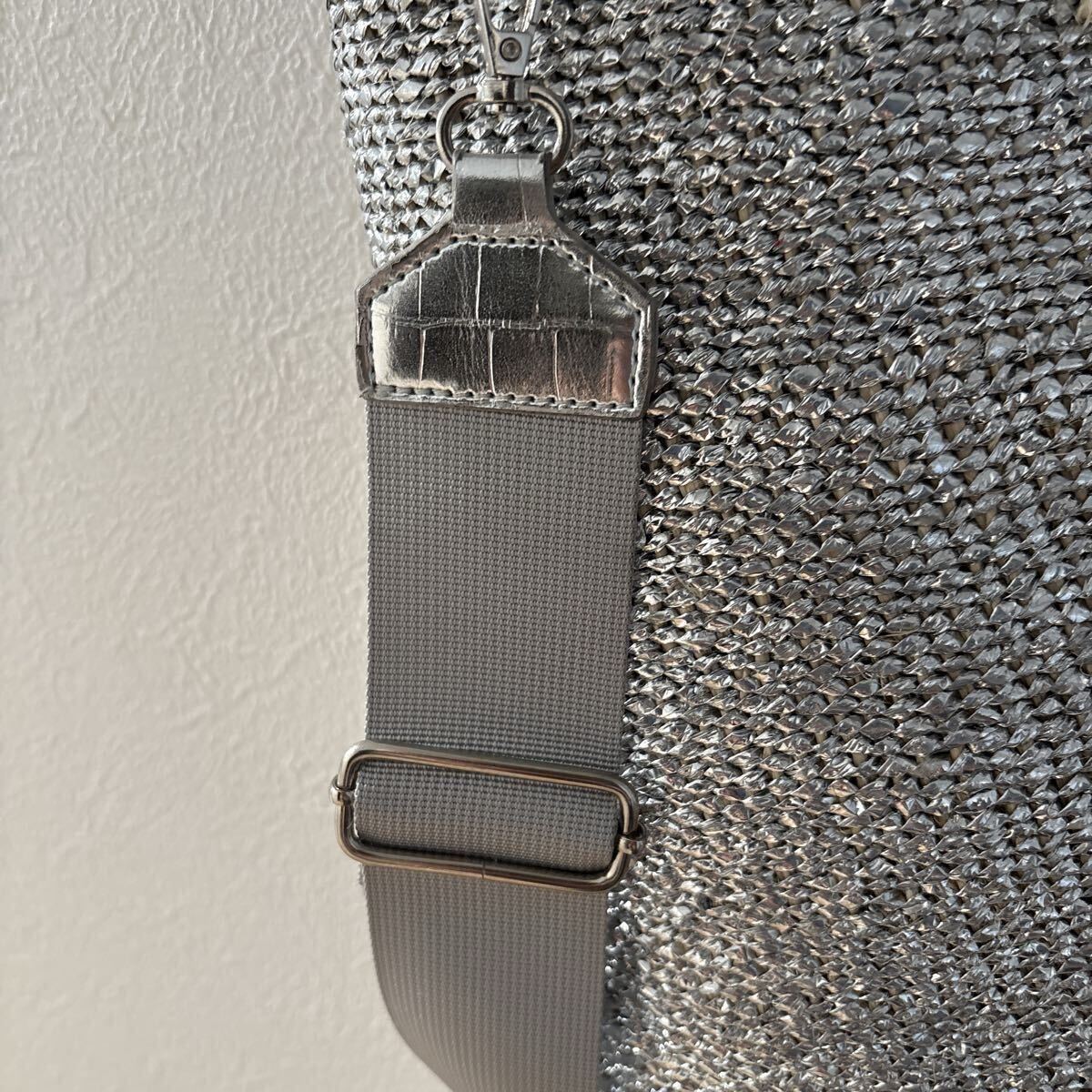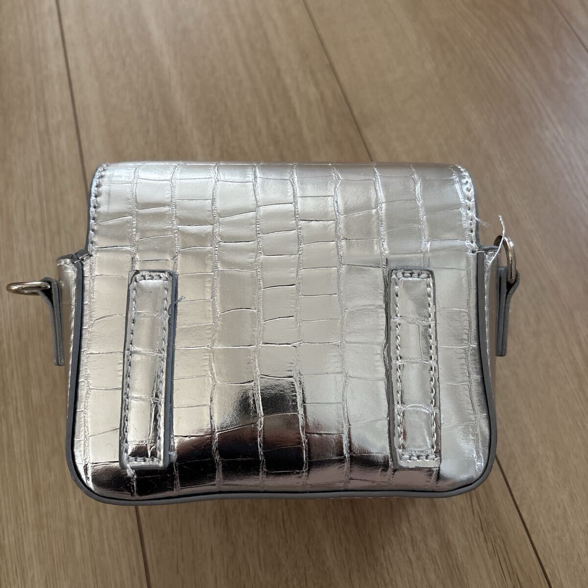 シルバーグレーにクロコ調フェイクレザーがアクセントの珍しいショルダーがついたタイプです。