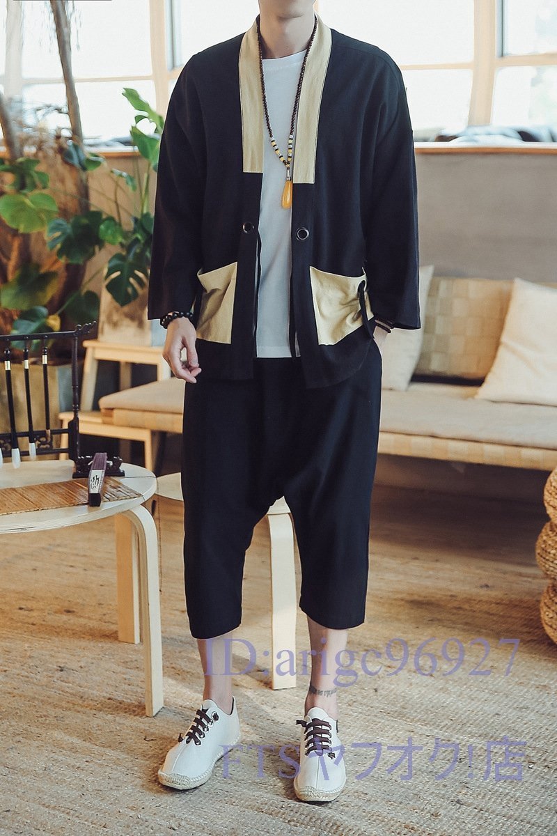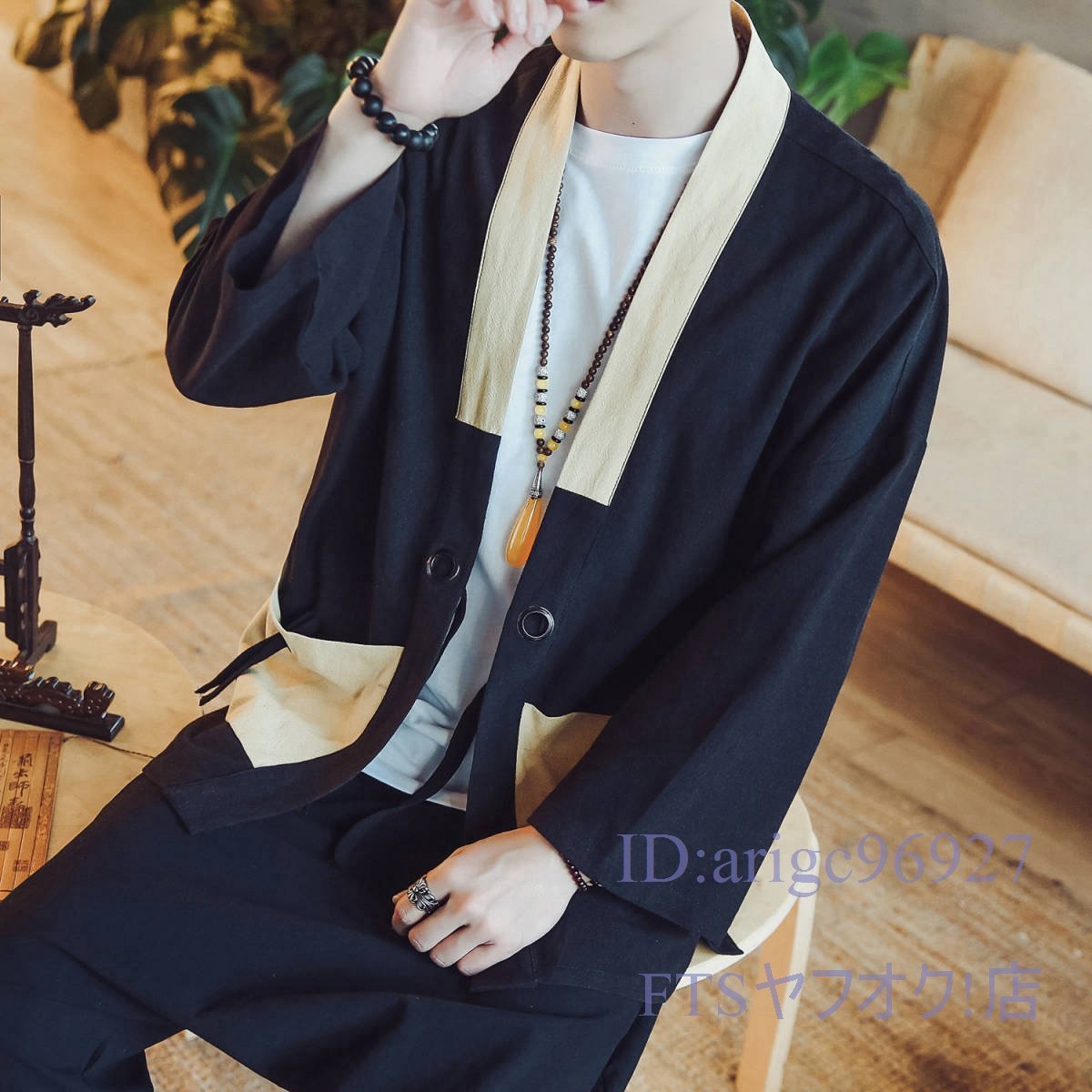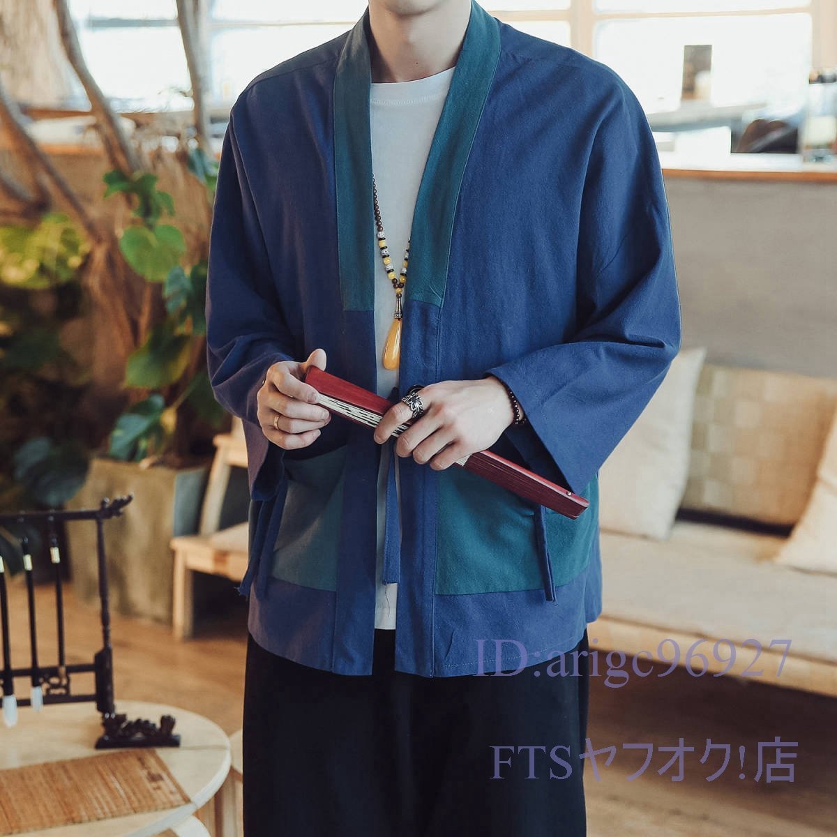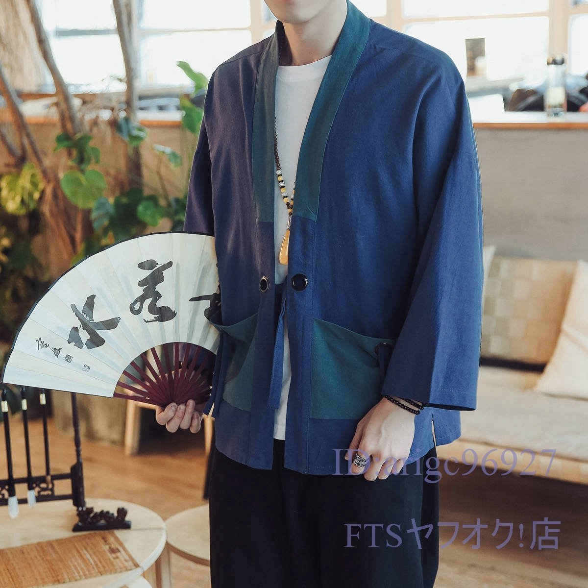 A2559☆新品ジャケット メンズ 無地 麻 ゆったり目 開襟 大きいサイズ 部屋着 七分袖 春夏秋 切り替え 夏物 ネイビー XL-5XL
