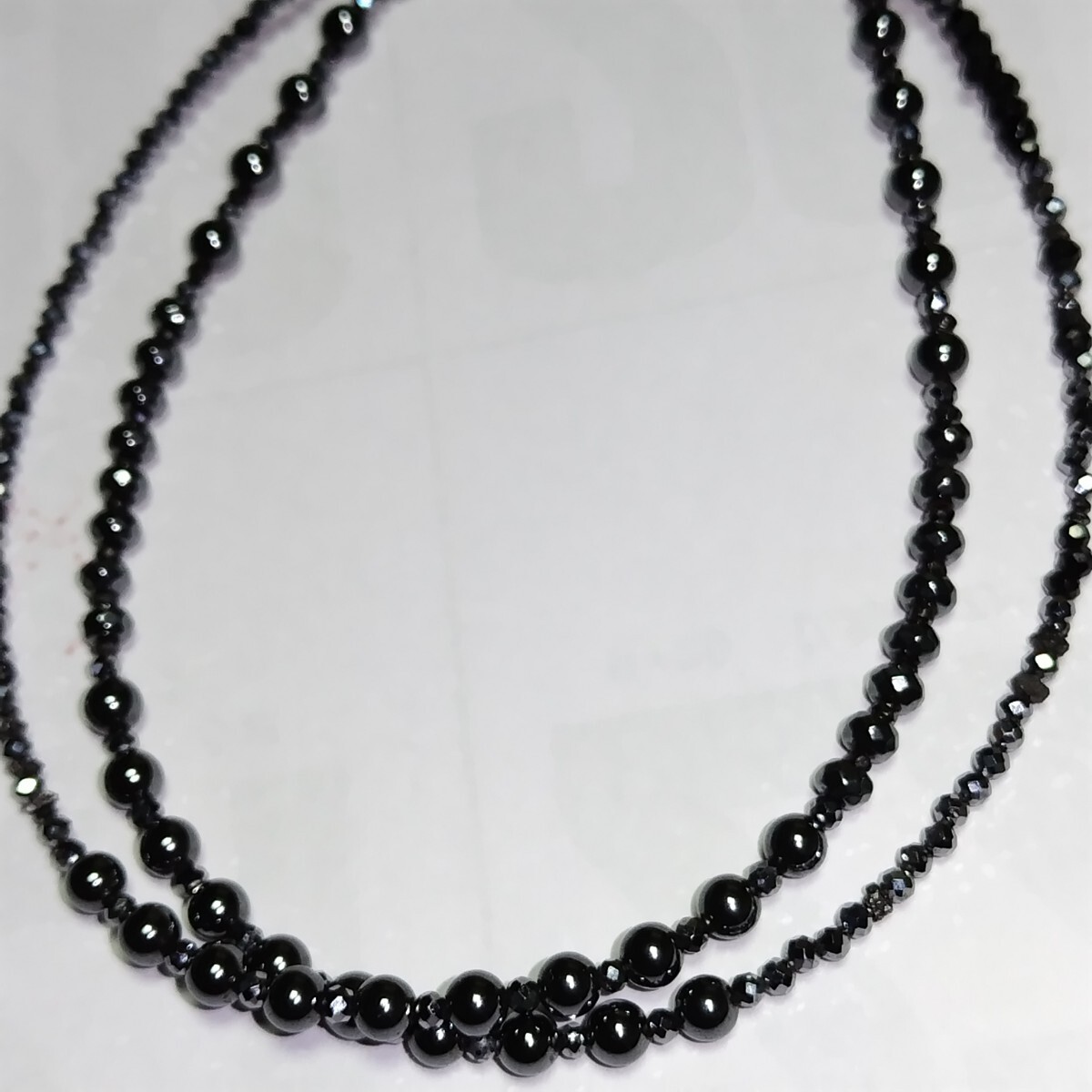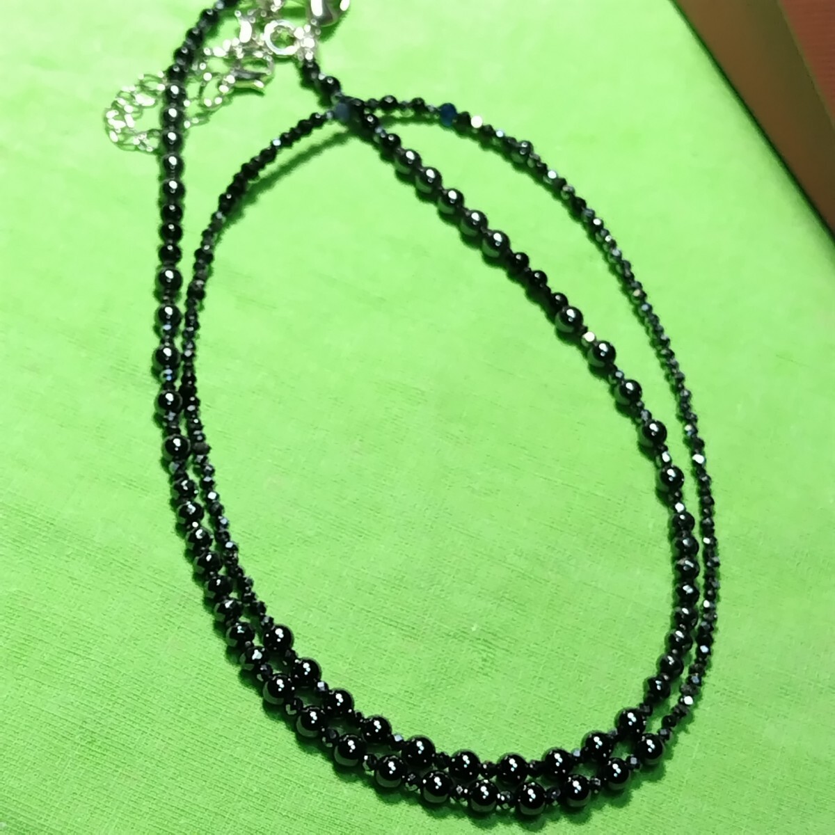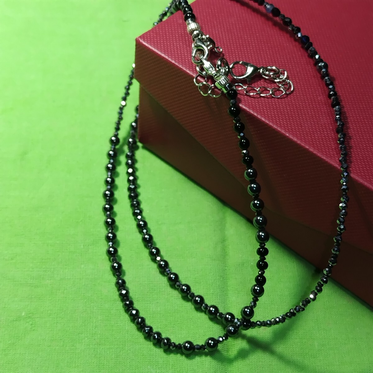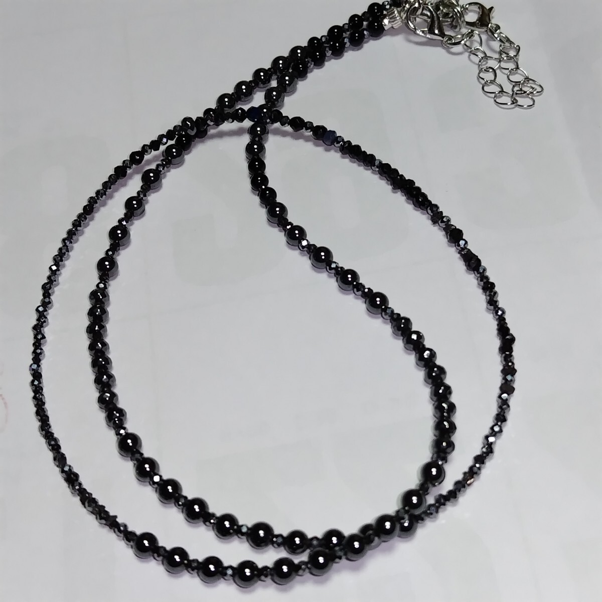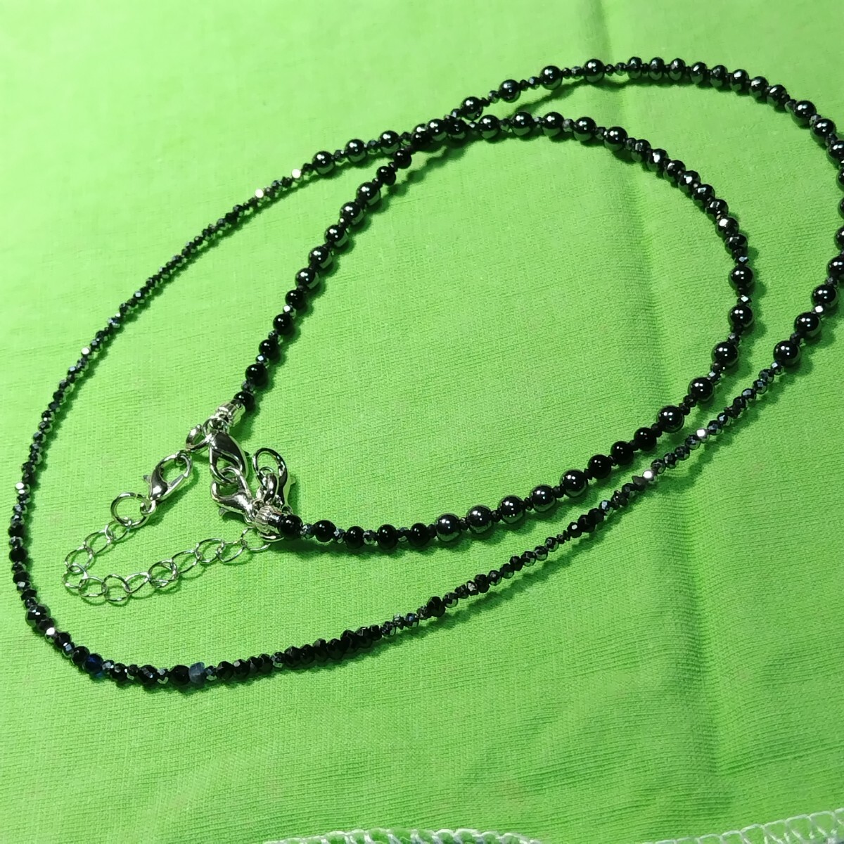 ブラック系のネックレス(テラヘルツ、スピリネス、ヘマタイト、ブラックダイヤ、オニキス)5種類の天然のネックレスになります。上部(テラヘルツ40石、オニキス14石、スピリネス38石、ブラックダイヤ57石)計149石、下部(ブラックダイヤ57石、テラヘルツ69石)計126石、総合計275石になります。長さ59.5cm、重さ15gカラット75CT、天然石を5種類あしらって仕上げました、他にない黒の宝石を是非堪能して下さい。キラキラとよく輝きます。石に多少の誤差などあります。
