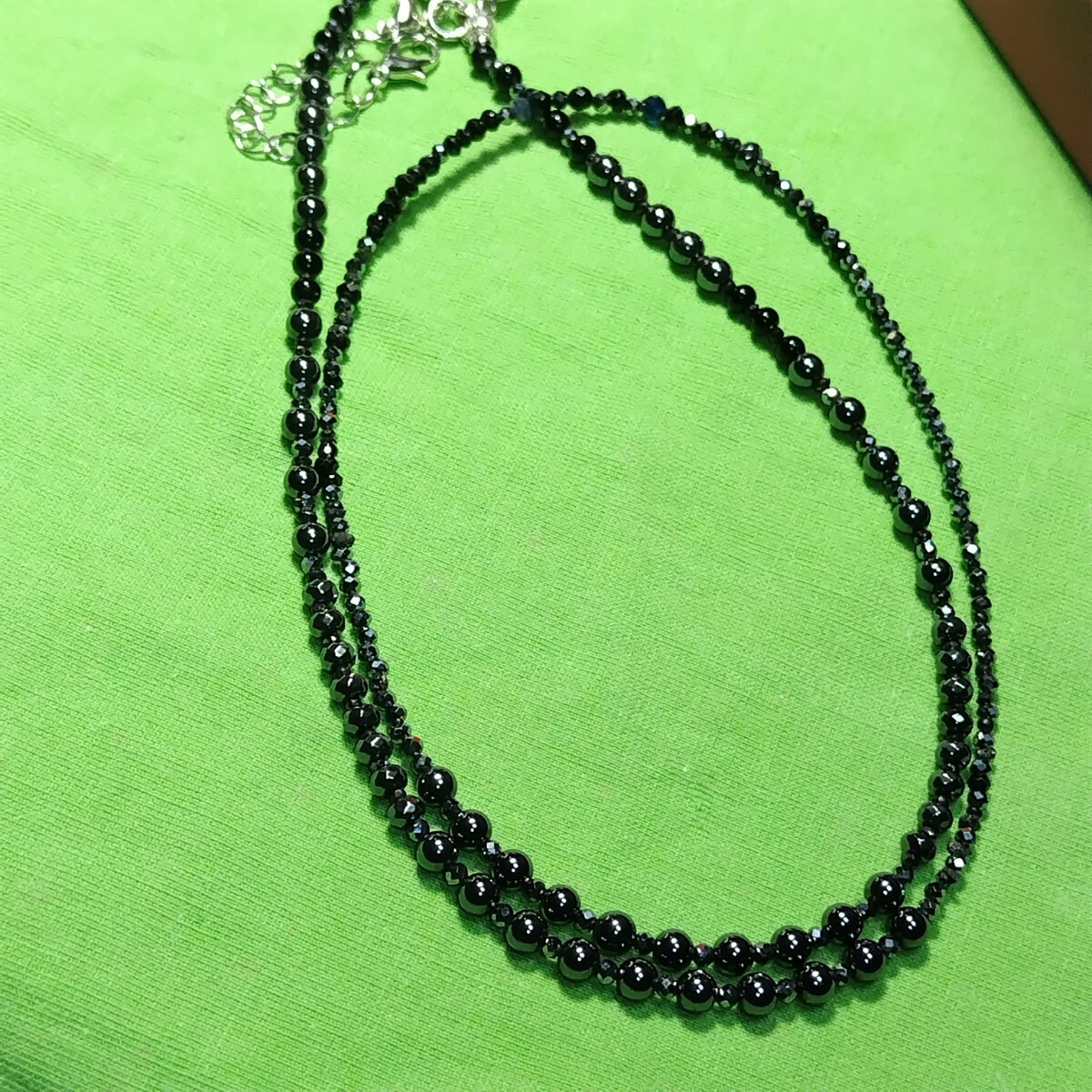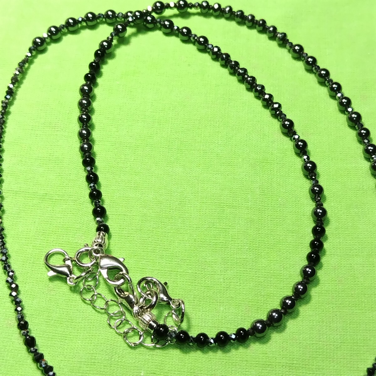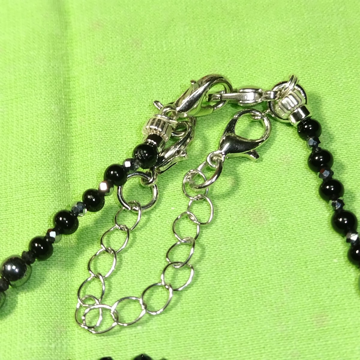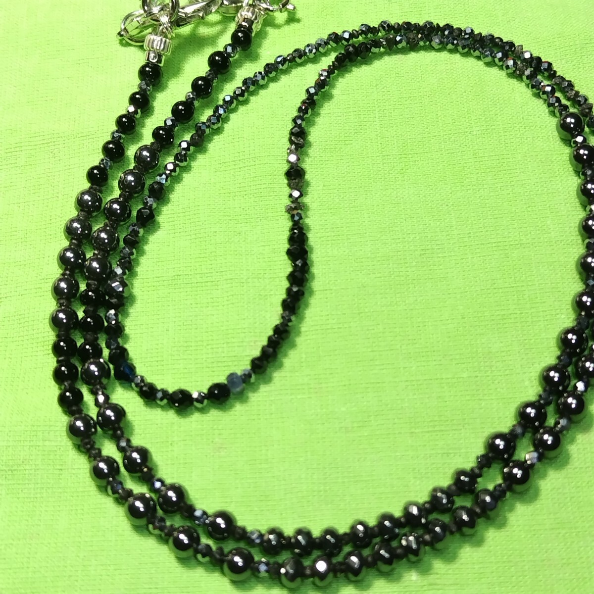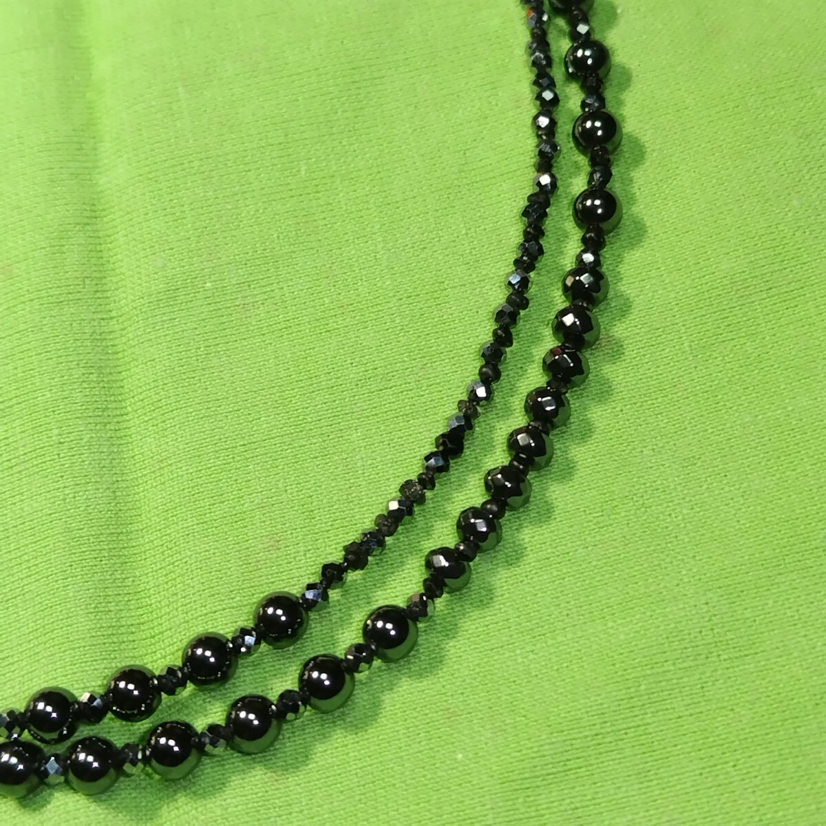 ブラック系のネックレス(テラヘルツ、スピリネス、ヘマタイト、ブラックダイヤ、オニキス)5種類の天然のネックレスになります。上部(テラヘルツ40石、オニキス14石、スピリネス38石、ブラックダイヤ57石)計149石、下部(ブラックダイヤ57石、テラヘルツ69石)計126石、総合計275石になります。長さ59.5cm、重さ15gカラット75CT、天然石を5種類あしらって仕上げました、他にない黒の宝石を是非堪能して下さい。キラキラとよく輝きます。石に多少の誤差などあります。
