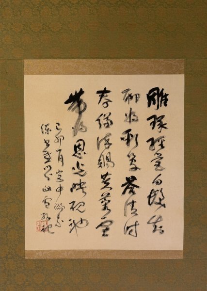 橋本 関雪(はしもと かんせつ、1883年〈明治16年〉11月10日 - 1945年〈昭和20年〉2月26日) 本名は貫一。中国の古典文学や風物を題材にした作品や、「新南画」と呼ばれる作風を確立した。建築や造園にも造詣が深く、明石市東二見町の「蟹紅鱸白荘」(現白沙荘)を初め3棟の別荘を建てた 橋本雪屋 はしもと せつや 箱書鑑定家・明治38年兵庫県に生まれる。橋本関雪の長男。名は節哉。渡欧二回。大正10年関雪と共にフランス・ドイツ・オランダ・イタリア等を巡る。春陽会に出品。 表装 約132㎝ ×約46.5㎝ 本紙 約39.5㎝ ×約35.5㎝ 二重箱・絖本・ 橋本雪屋鑑識箱 【模写】橋本関雪 七言絶句 漢詩 絖本 橋本雪屋鑑識箱 二重箱 掛軸 兵庫県生 / 中国-古典文学や風物に博識・呉昌碩-交流 |