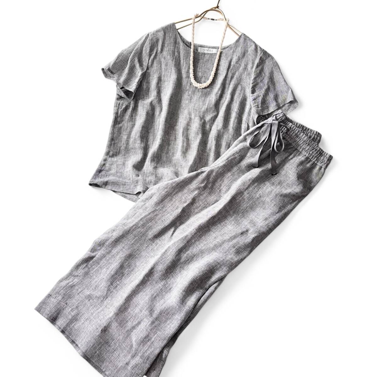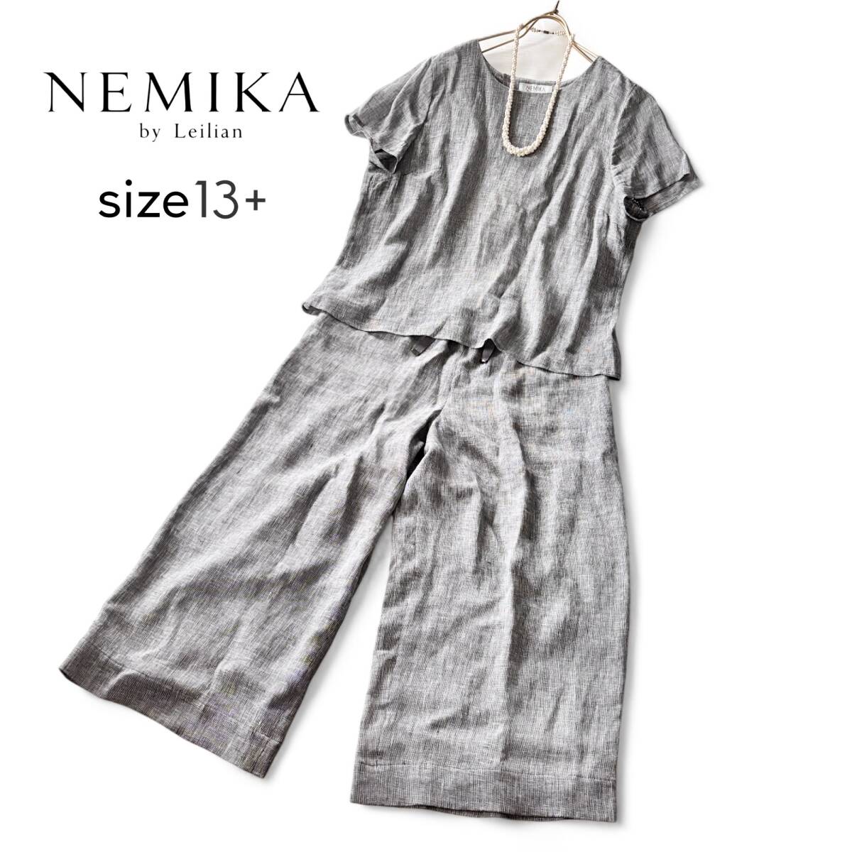 美品 10B04 XL前後 13プラス《レリアン ネミカ Leilian NEMIKA》プラスハウス リネンブレンド セットアップ トップス&ワイドパンツ グレー