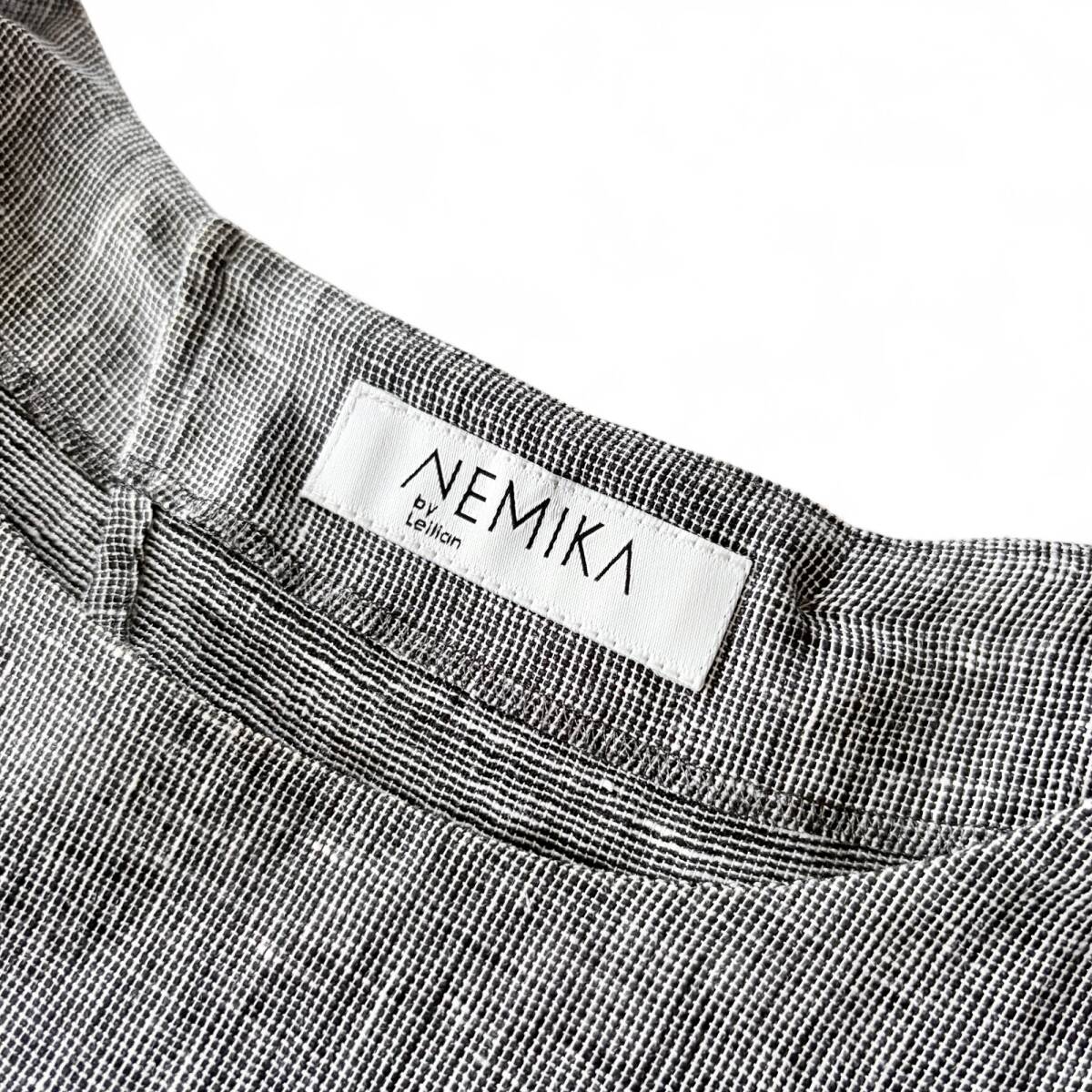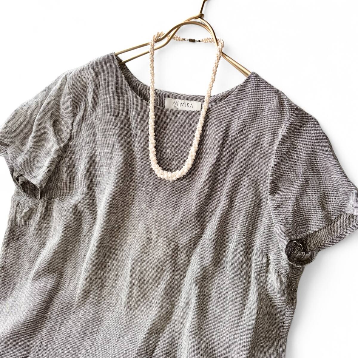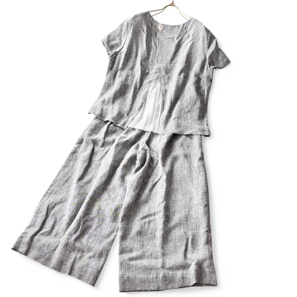 リネン特有のナチュラルな風合いが上品で、清潔感と涼やかさを兼ね備えた一着。